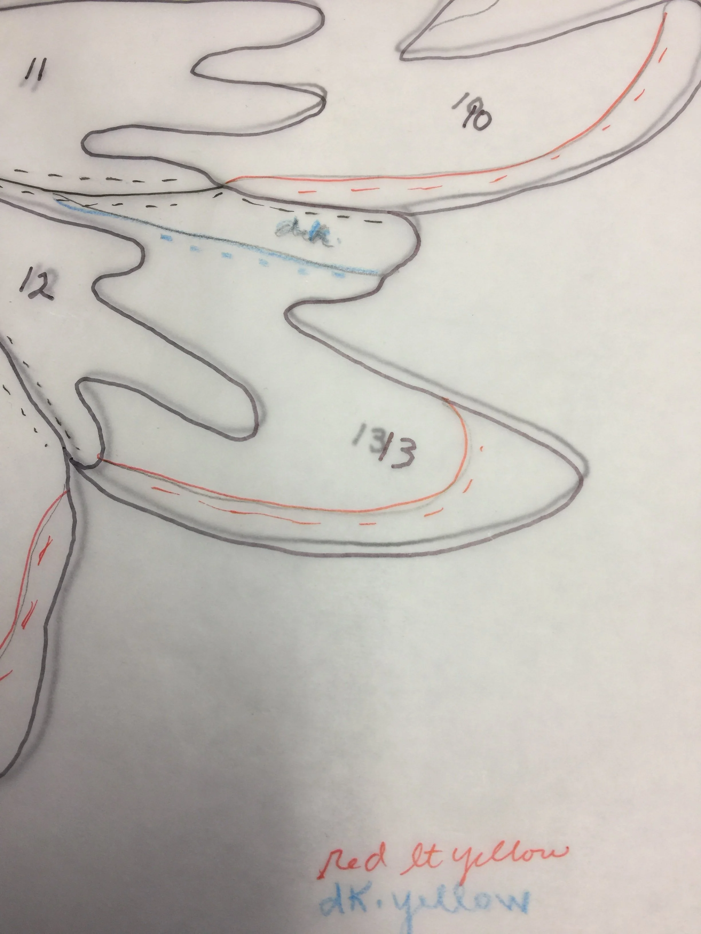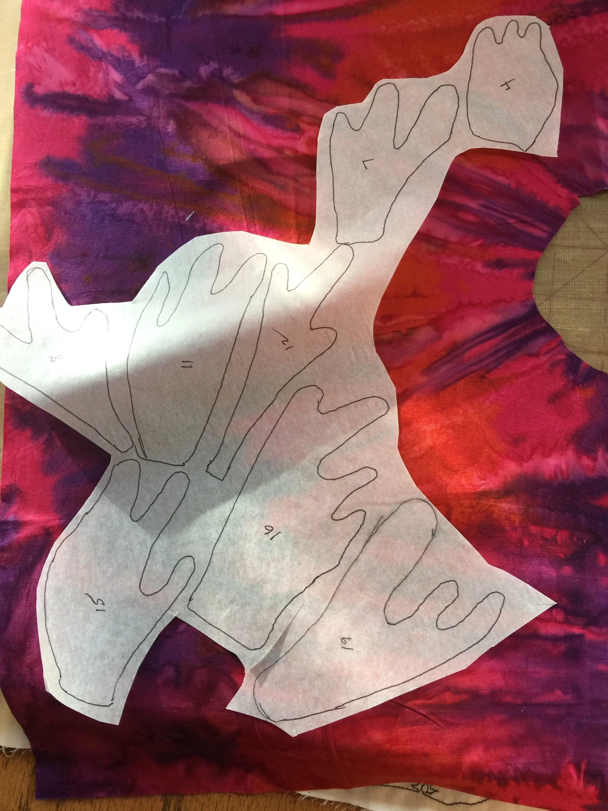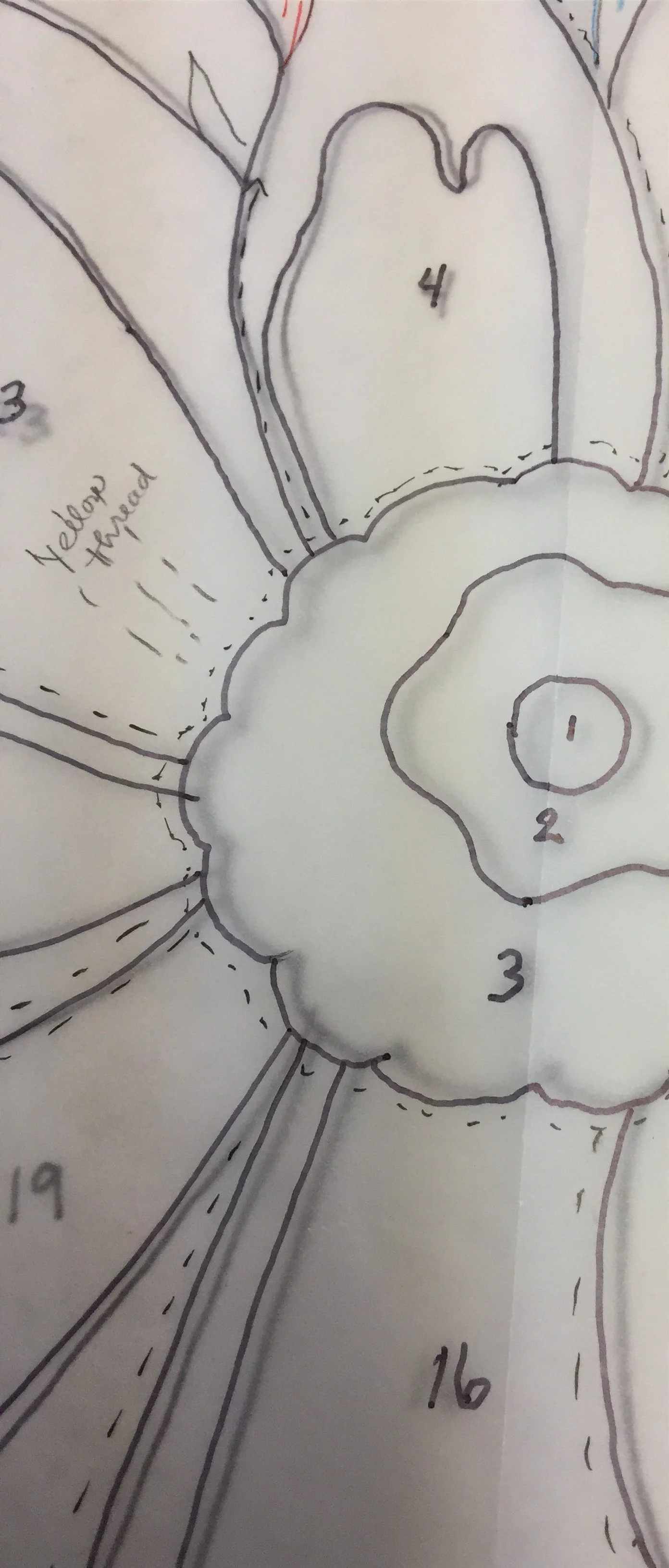 Once you have the image printed, you can use tracing paper to draw the lines you want. You can change the image any way you want, include as much of the detail as you want. Then you need to use the system that works best for you to finalize your pattern. On this one, I used dashed lines to show what pieces fit UNDER other pieces. I decided where to start on the pattern. I numbered the pieces in the order they were to be done. In this case, they were to start with the highest number down first, working toward 1, the last piece.