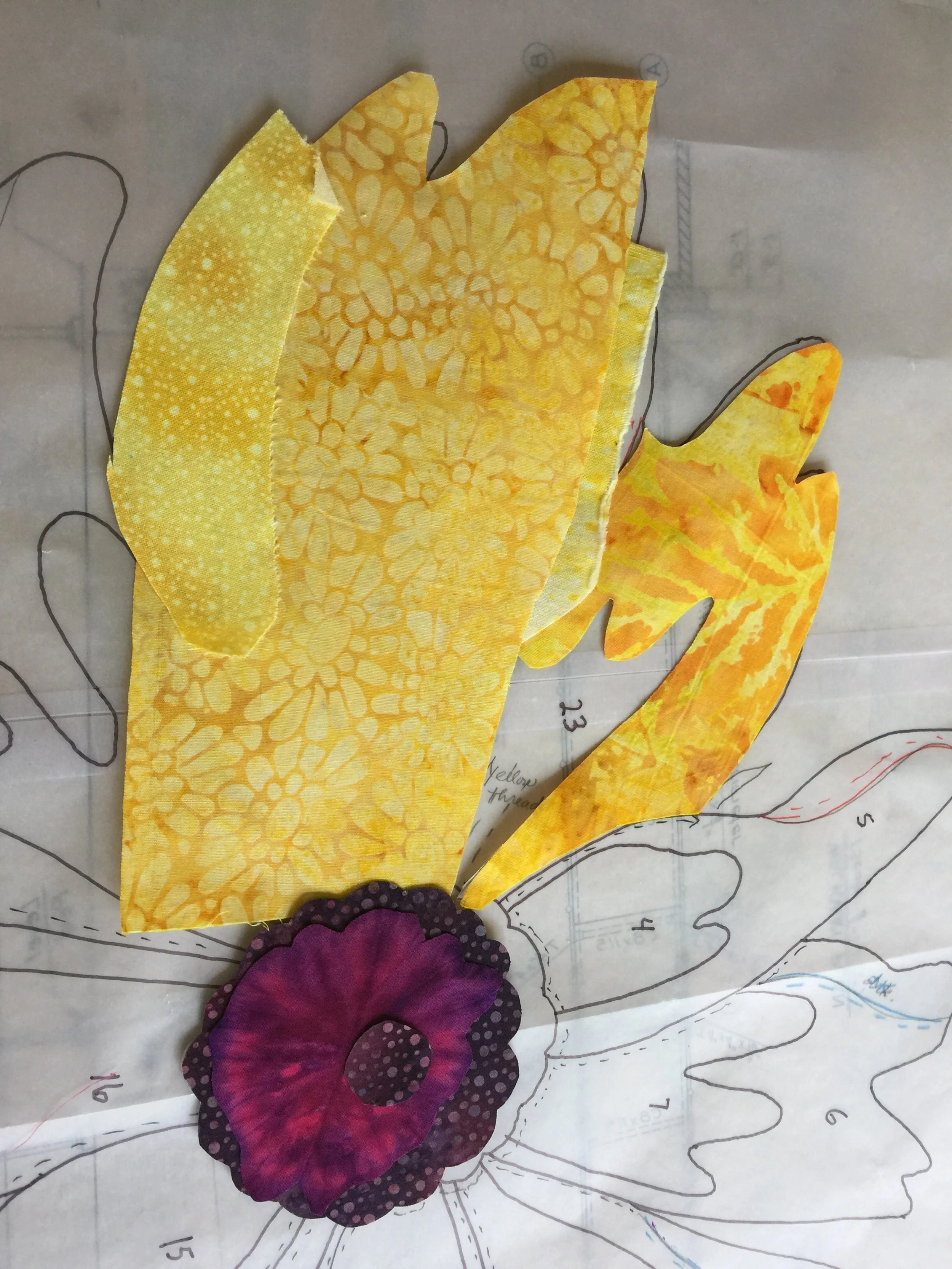 We gave them copies of the pattern and they were to trace their pattern onto the vinyl we gave them. The dotted lines represents the part of the pattern that needs to be cut ¼” larger than the solid line. This piece was to go UNDER the other piece. These are sometimes called “undies.” TIP: Usually, the lightest value goes under the other fabric piece, so that the dark fabric doesn’t show through. Then we had them use fusible to cut out the patterns. We discussed using freezer paper if they chose to in the future. We discussed there are several ways to build your, in this case, flower. You can build on your chosen background, or as we demonstrated, you can build on muslin, or tracing cloth 830 Easy Pattern Pellon, and then audition various backgrounds after it’s completed. You move your piece on top of one fabric after another until you like the effect.