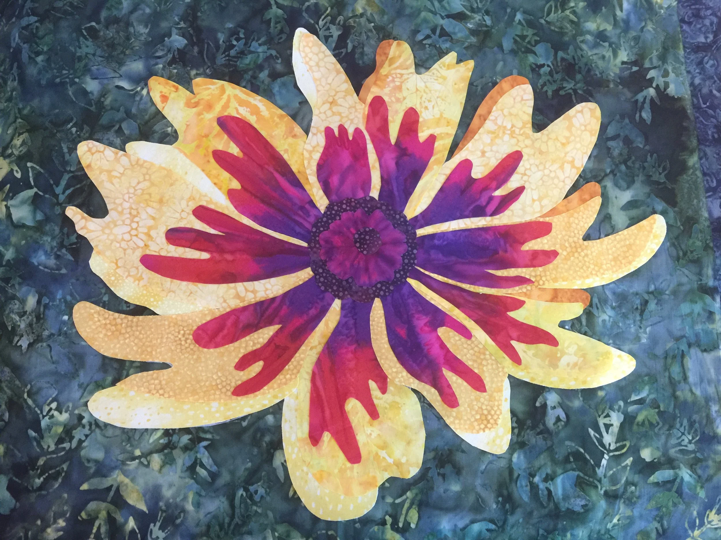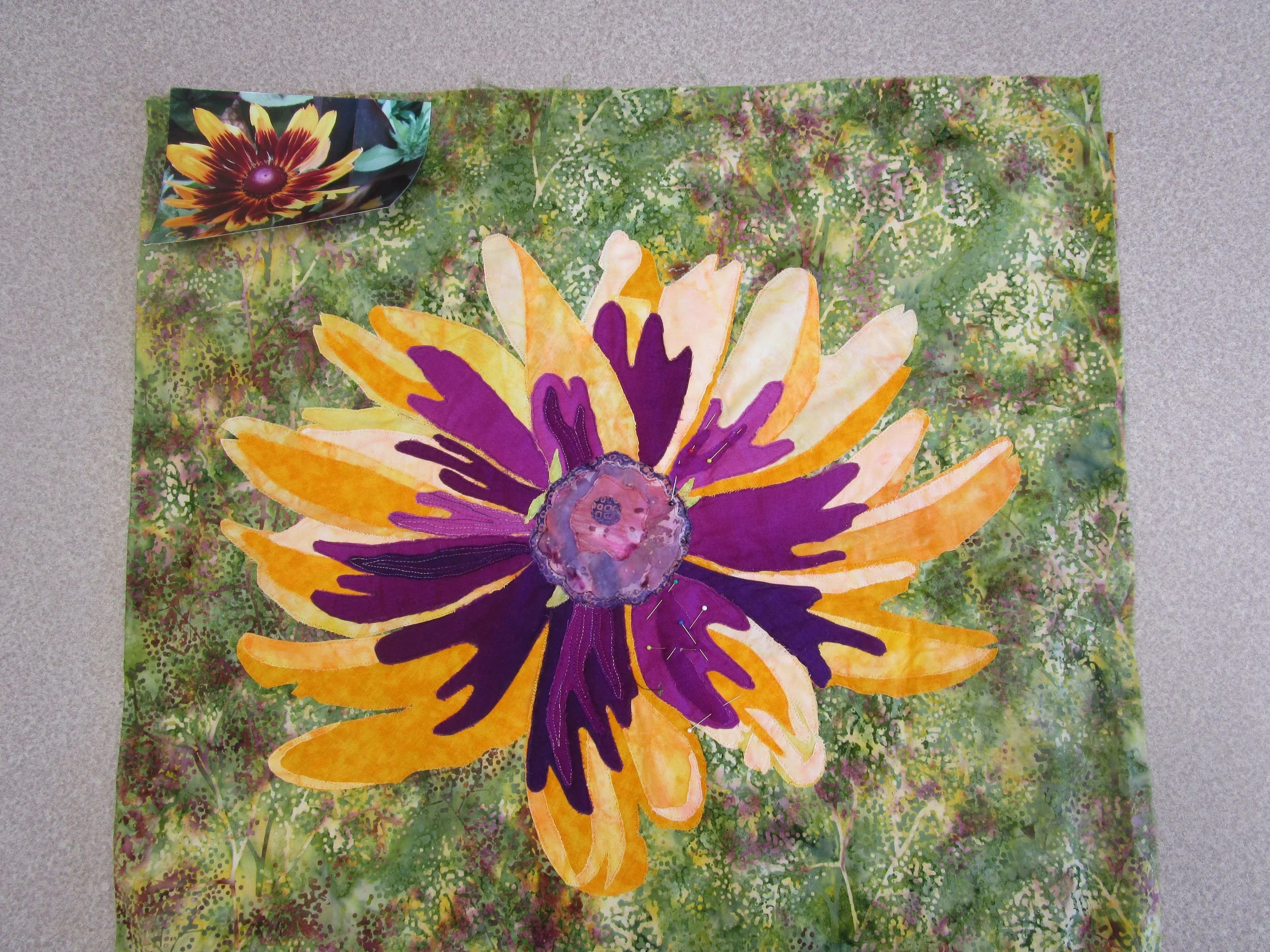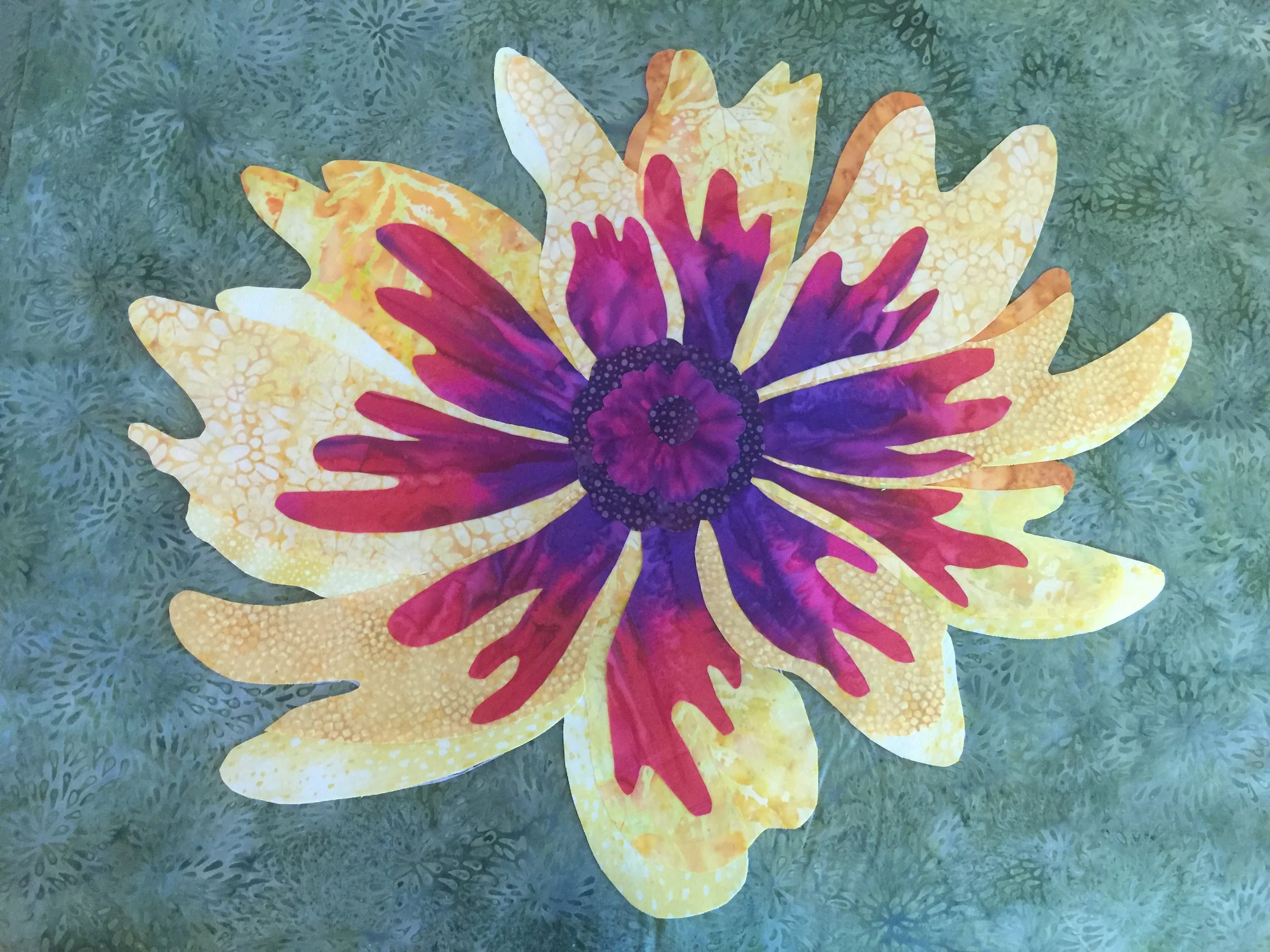 Patti Cantu and I have been attending a quilt retreat in Brunswick for several years. The ladies are mostly traditional and asked if we would do a workshop for them at the next retreat in 2017 to make an art wall hanging. One of the ladies had a photo of a flower they decided they wanted to make. So, Patti and I worked together to make a pattern . Our first pattern we felt was too complicated, too many pieces, for them given their experience and the time factor. So, I used https://www.blockposters.com/ to create a photo. I gave them a handout explaining how to use block poster website in the future for their own photos.