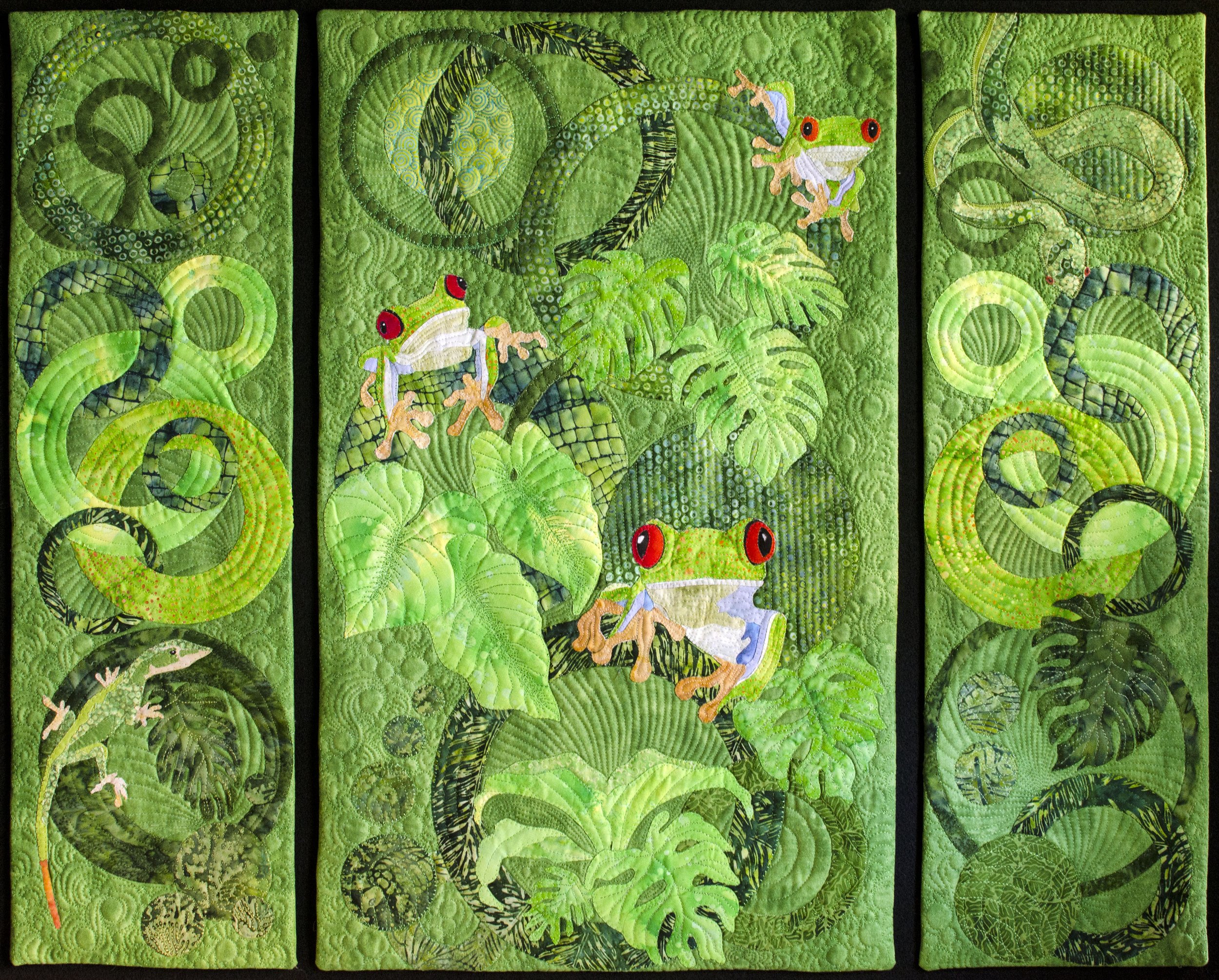 "Go Green Save Green Triptych", juried into the special exhibit, Save the Planet! 2024, for the 50th Anniversary of the International Quilt Festival in Houston, Texas, Oct.31-Nov.3, 2024.