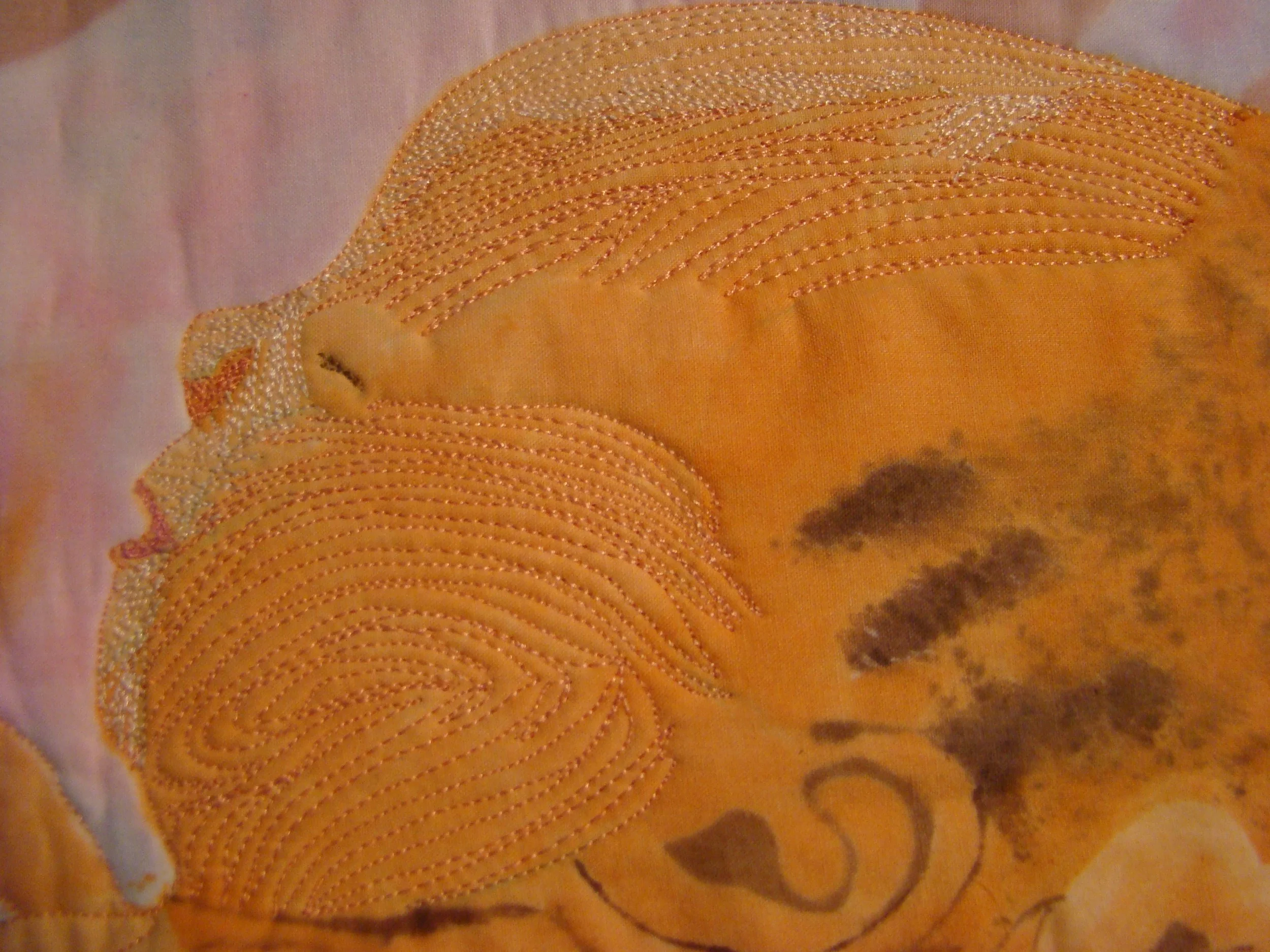 I was SO AFRAID I would “mess” up Sydney’s quilt, that I had to think and think before I quilted an area, just to make sure I was making the stitches in the direction I wanted to give it the dimension I wanted. I wished I had done a quilt which did not mean as much to me, because I could have gotten more done. However, I would NOT have learned as much. Now that the quilt is finished, I feel like I could tackle ANYTHING. I took the class May 4, 2008, and I could not bring myself to touch it again, for fear of “messing it up.” Finally, six months later in October, 2008, I decided that I had to finish it to enter in the 2008 Columbia Quilt Show. So, I entered the quilt, and then still procrastinated starting it, until I had just a week left. I finally forced myself to attempt the completion of it. So, I took a deep breath, contemplated how to do the stitching and finished the head. The hair was also a challenge for me to quilt. I told myself I would just concentrate on one area at a time.