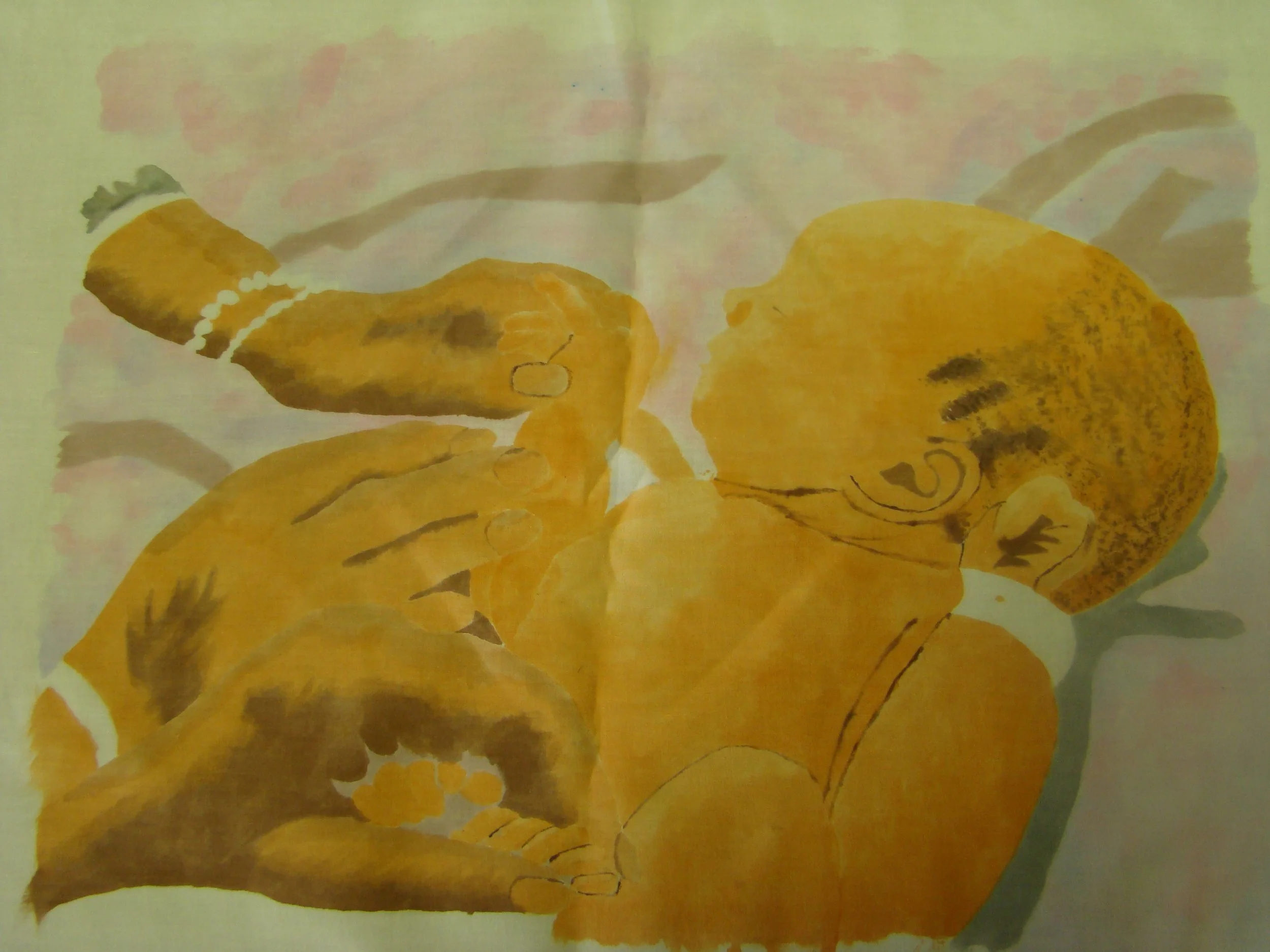 Hollis gave me the “recipe” for the color she thought would be best for baby’s skin. While painting it on, I kept thinking this is WAY too dark. She said it would lighten considerably, which as you see, it did, although I would have preferred a more “pink” tint to the skin for a baby. It was a five day workshop, and I got just a portion of the head done on the quilting at the end.