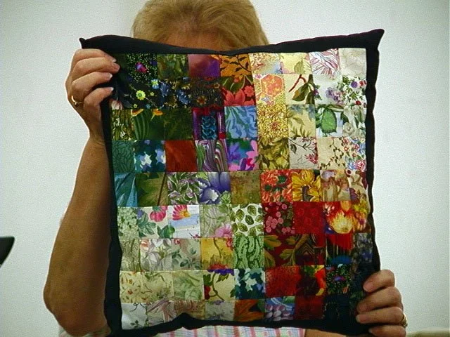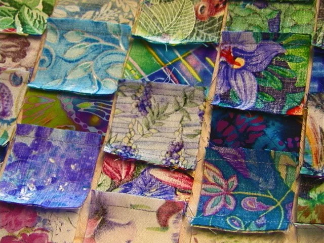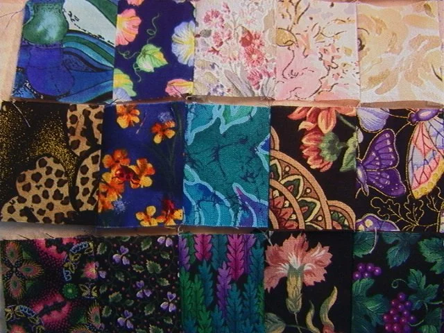 After the squares are laid out on flannel in the design you want, I start sewing the squares vertically. I remove and lay the first two left vertical rows in precise order, on a firm cardboard or similar structure, so that they do not move or fall. You take them to your machine and starting with the first top 2 squares on the left, you sew the two squares together. Always use a small scrap of material to sew on first as a leader, then start your sewing of the squares. This keeps your threads from bunching up on the back. Once sewn, you do NOT cut the thread or remove the squares from the machine. You pick up the two squares in the second row, place them under the machine, carefully sewing a 1/4" seam. This attaches the first two with the second two, keeping them in their place in the design. Iron the seams in the same direction. Then you carefully lay the 3rd vertical row from the design, place them on your firm structure, take them to the machine, and continue until you have all the squares sewn vertically.