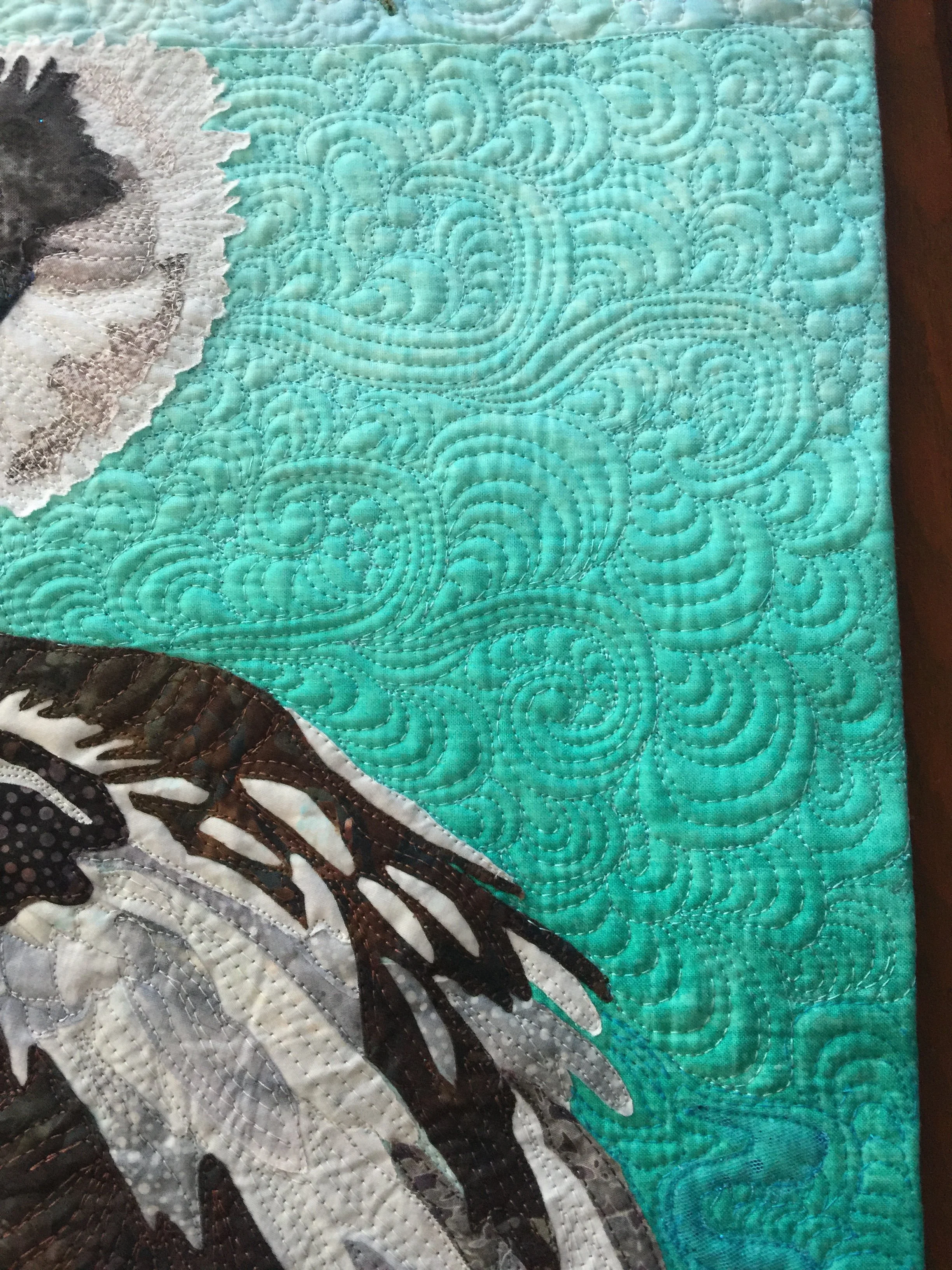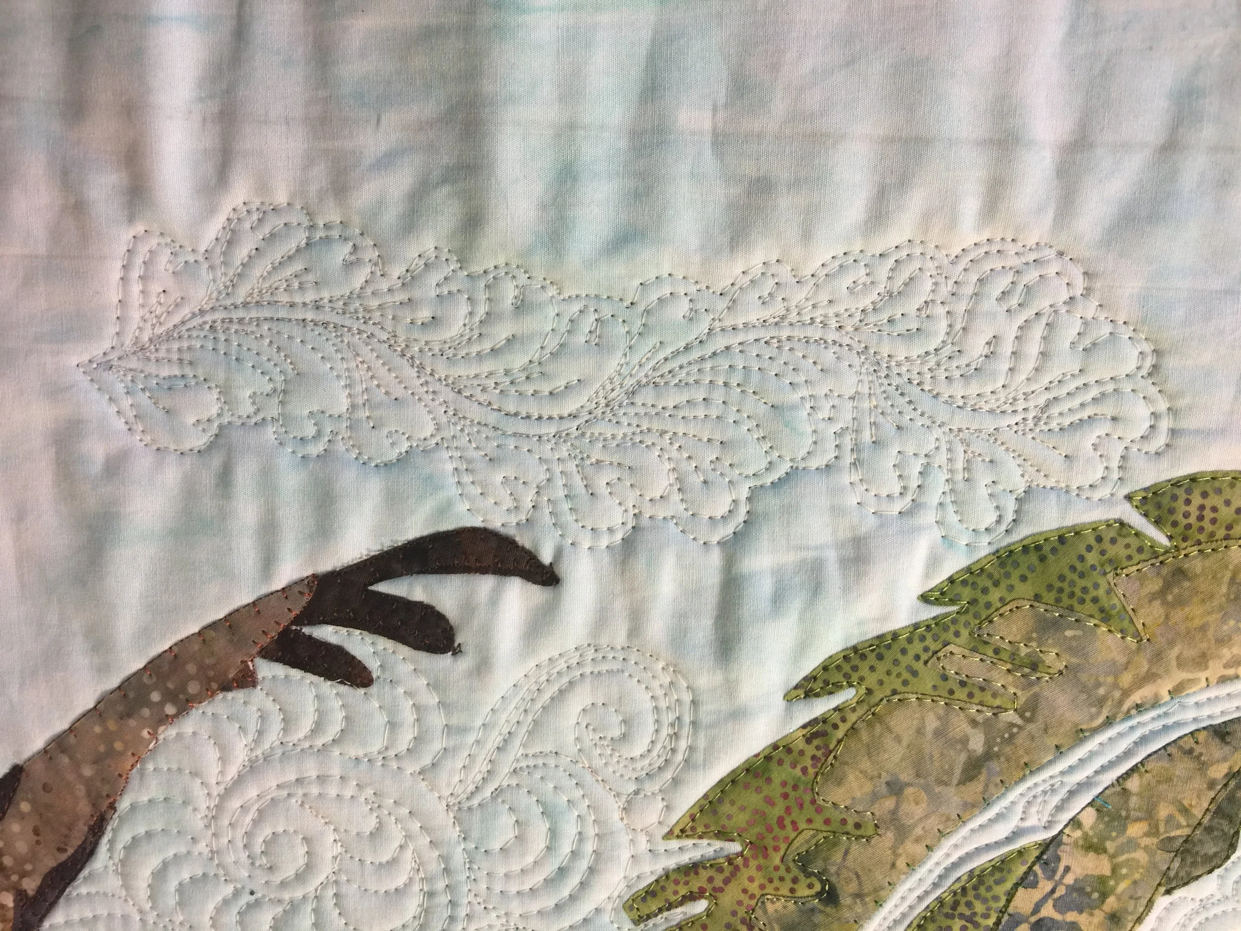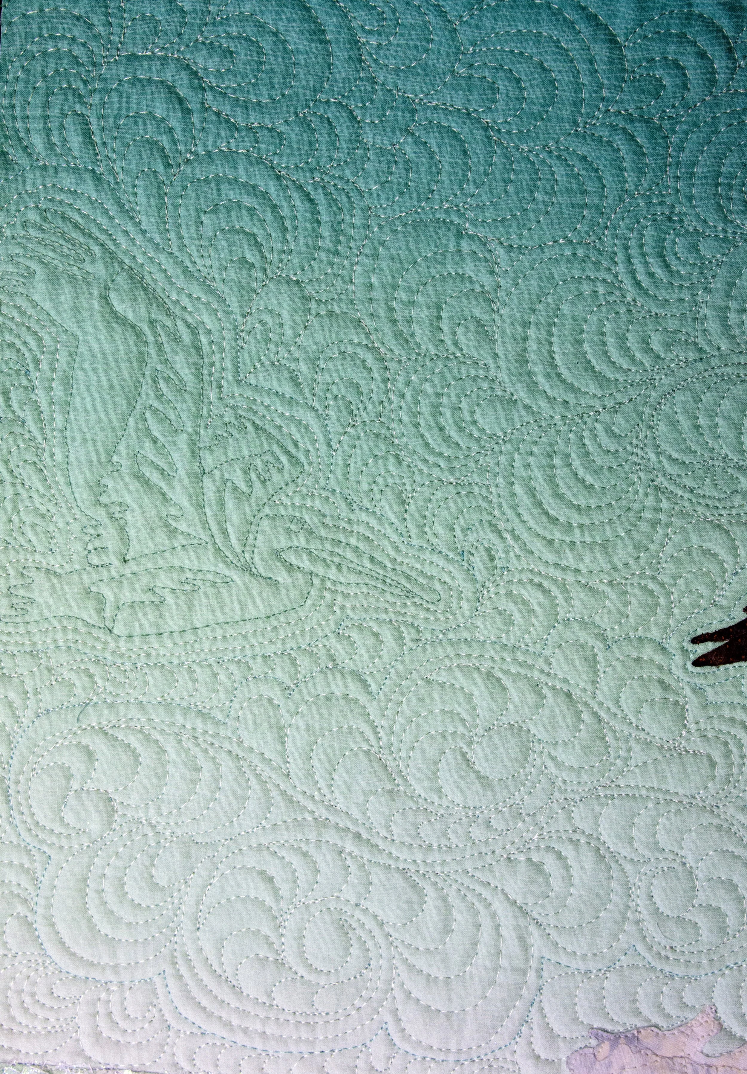 Once the pelicans and palm tree were appliquéd and free-motioned down, it was time to free-motion the background. This was difficult. I wanted to quilt water and sky like images. The first problem to solve was which thread to use. I wanted the threads not to show, but to match the background. I ended up using a darker teal for the water and lighter for the sky.