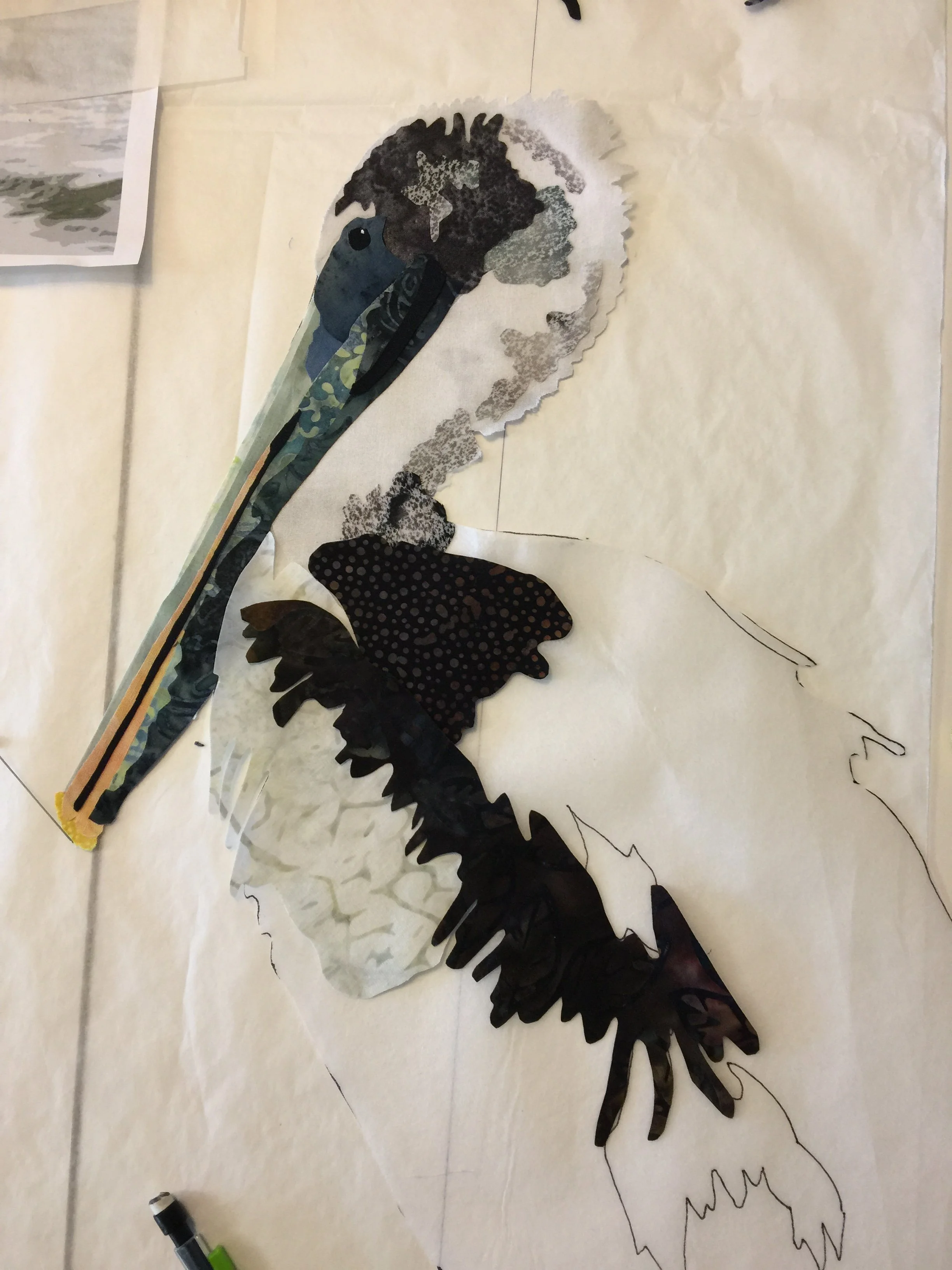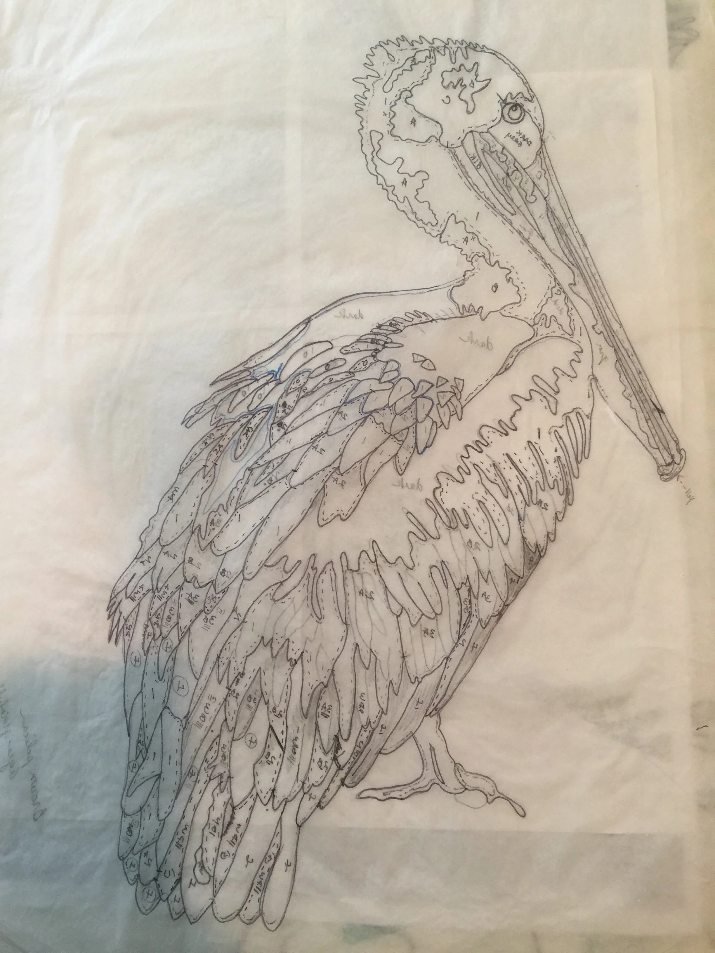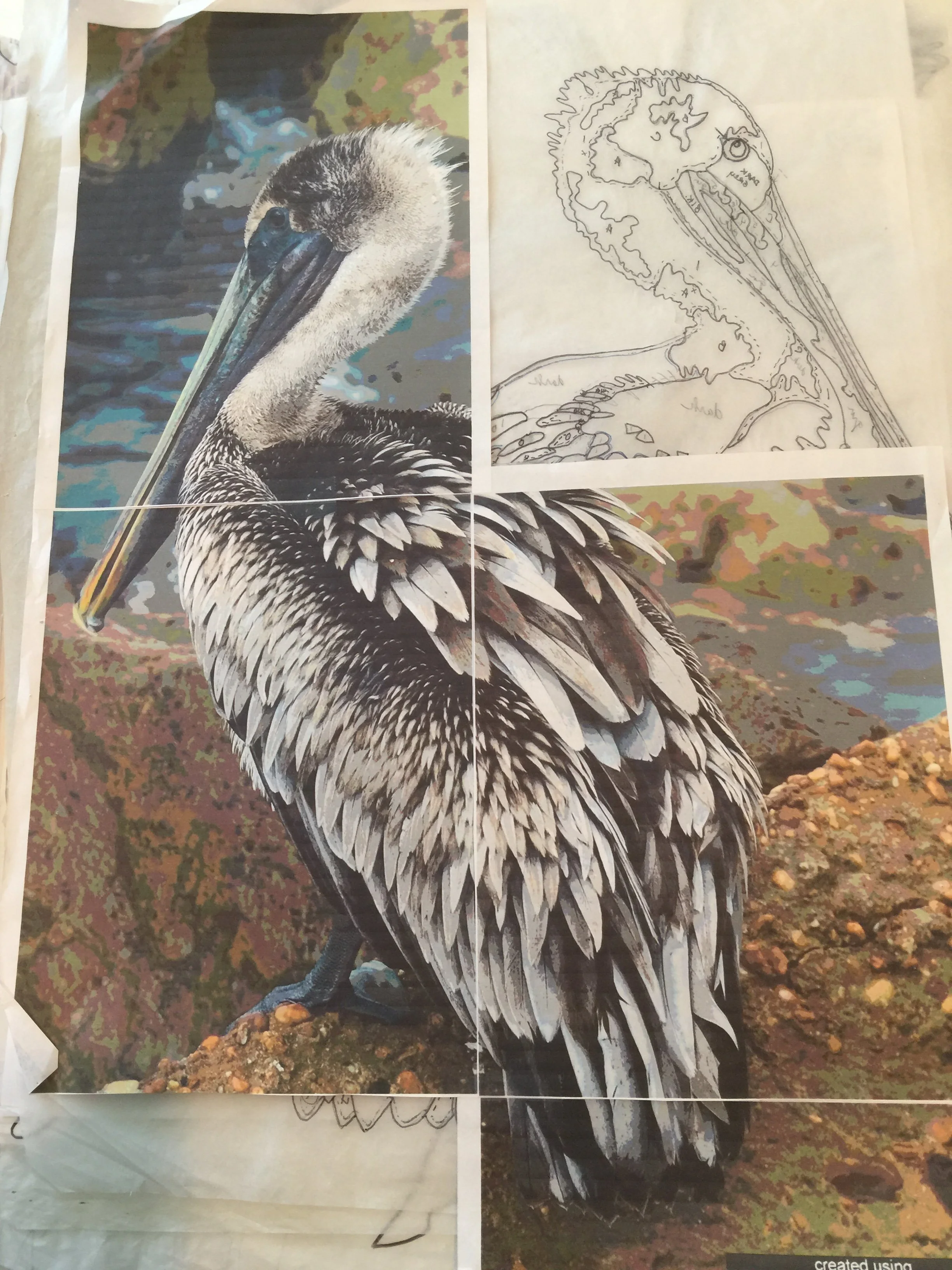 I decided on the size I wanted the pelicans to be. The first step of making the pattern was to go to https://www.blockposters.com/ and download my photo. You get to choose whether to make it one, two, or three pages long. I decided where I wanted them on the quilt, and made the birds decreasing in size, so I could make it look like some were further away from us, giving the illusion of depth. Once I printed the enlarged photo, I taped it together and decided how much detail I wanted and where to change the lines and value to get the look I wanted. I made the pelican who was landing smaller, so that he could be placed farther out in the ocean.
