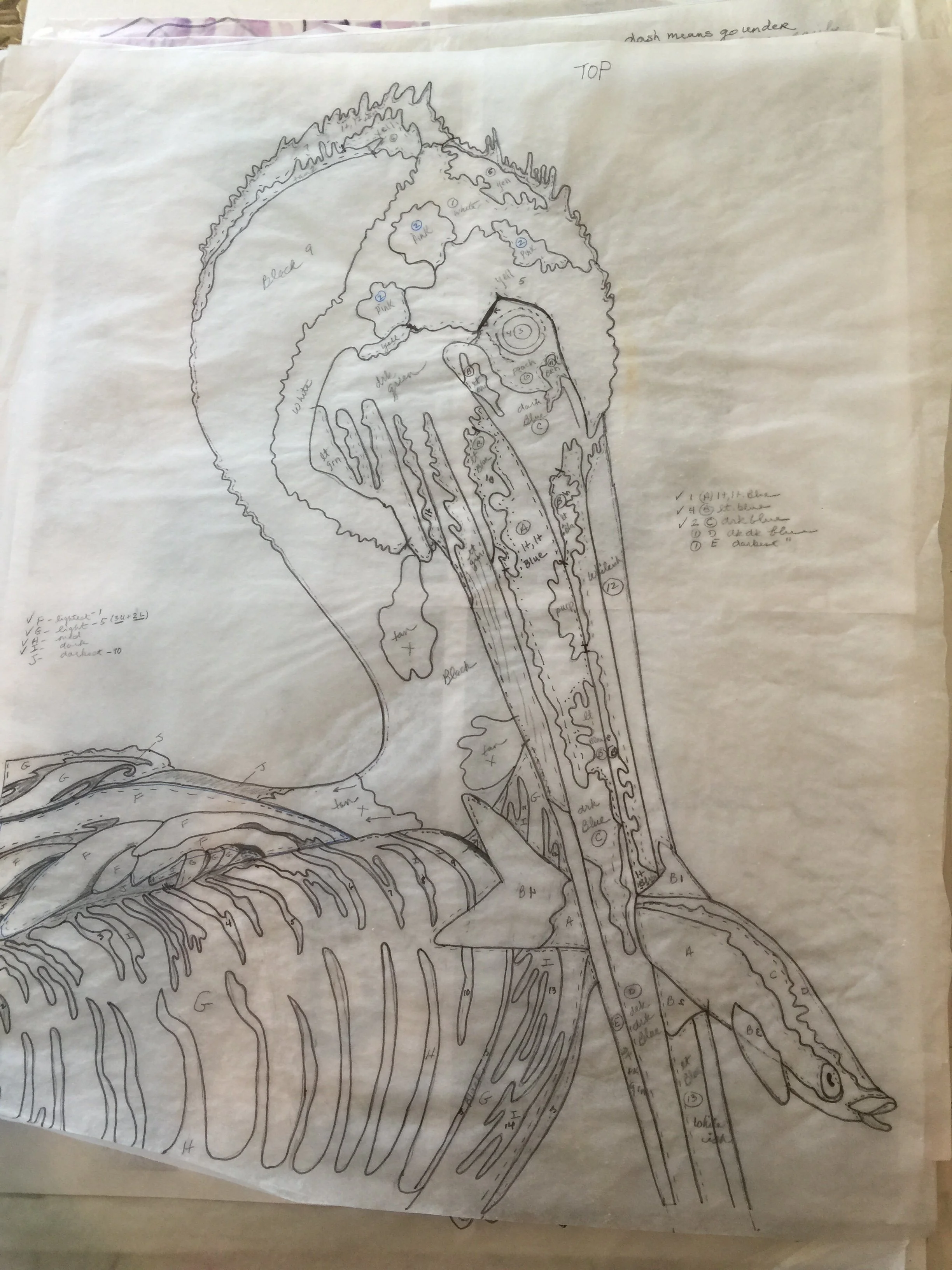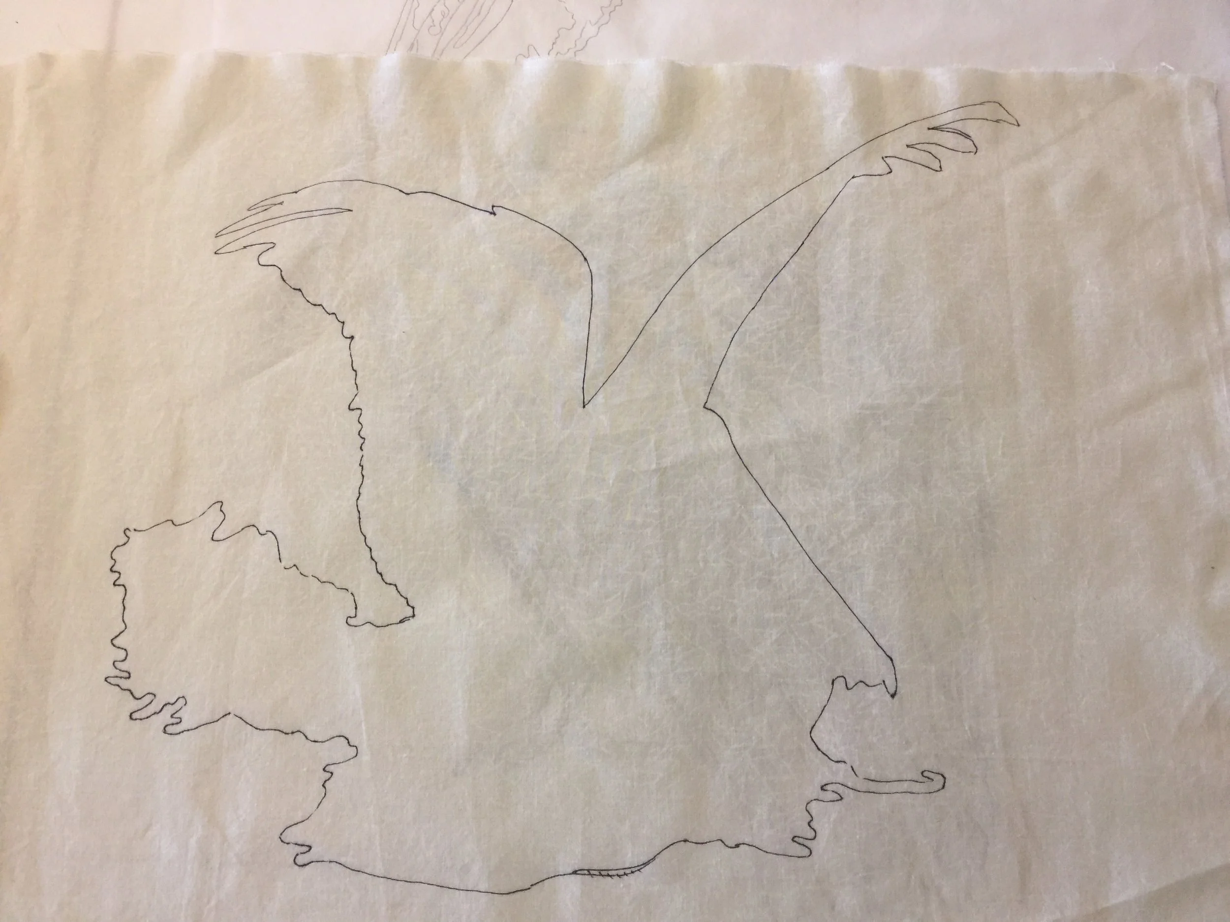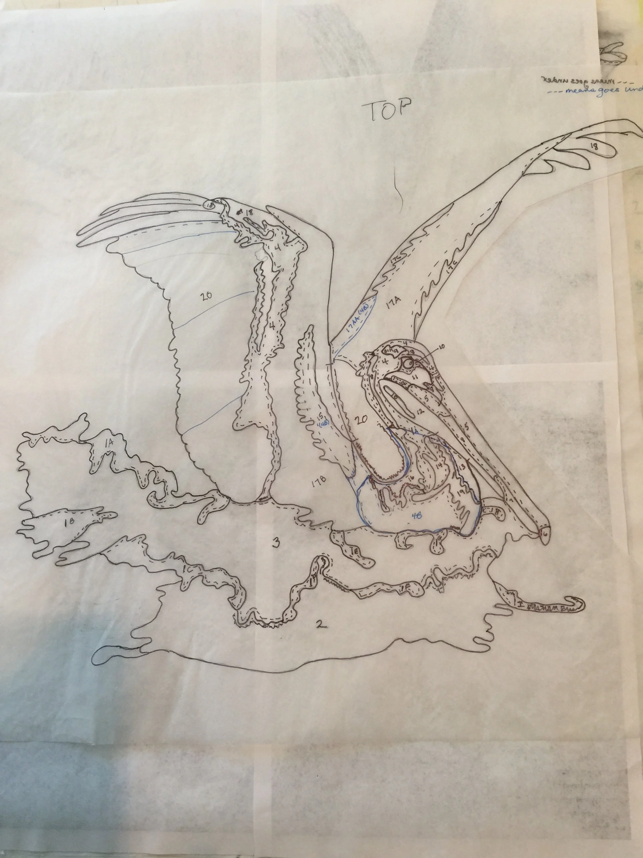 I decided on the size I wanted the pelicans to be. The first step of making the pattern was to go to https://www.blockposters.com/ and download my photo. You get to choose whether to make it one, two, or three pages long. I decided where I wanted them on the quilt, and made the birds decreasing in size, so I could make it look like some were further away from us, giving the illusion of depth. Once I printed the enlarged photo, I taped it together and decided how much detail I wanted and where to change the lines and value to get the look I wanted. I made the pelican who was landing smaller, so that he could be placed farther out in the ocean.