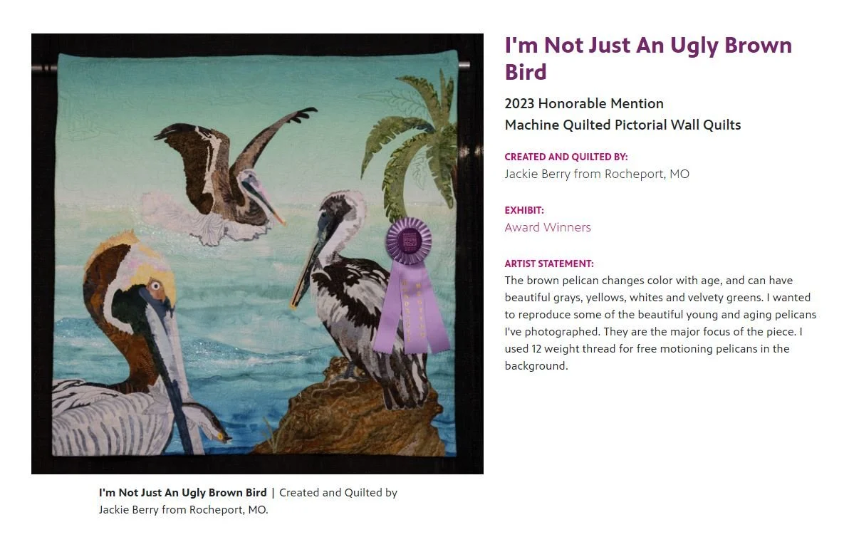 "I'm Not Just An Ugly Brown Bird", juried into The Great Wisconsin Quilt Show, Sept. 7-9, 2023. Honorable Mention in Wall Quilts – Machine Quilted- Pictorial
