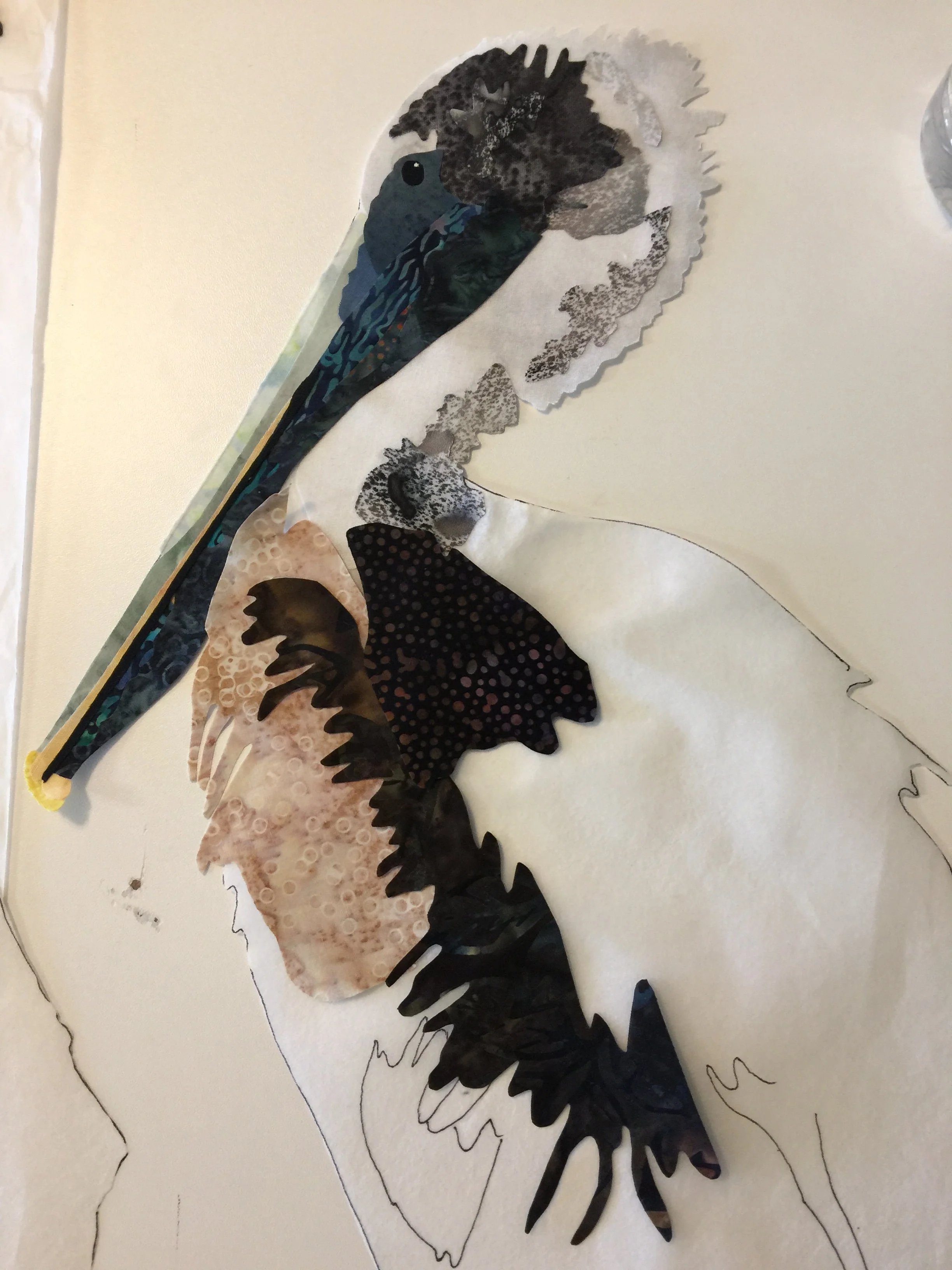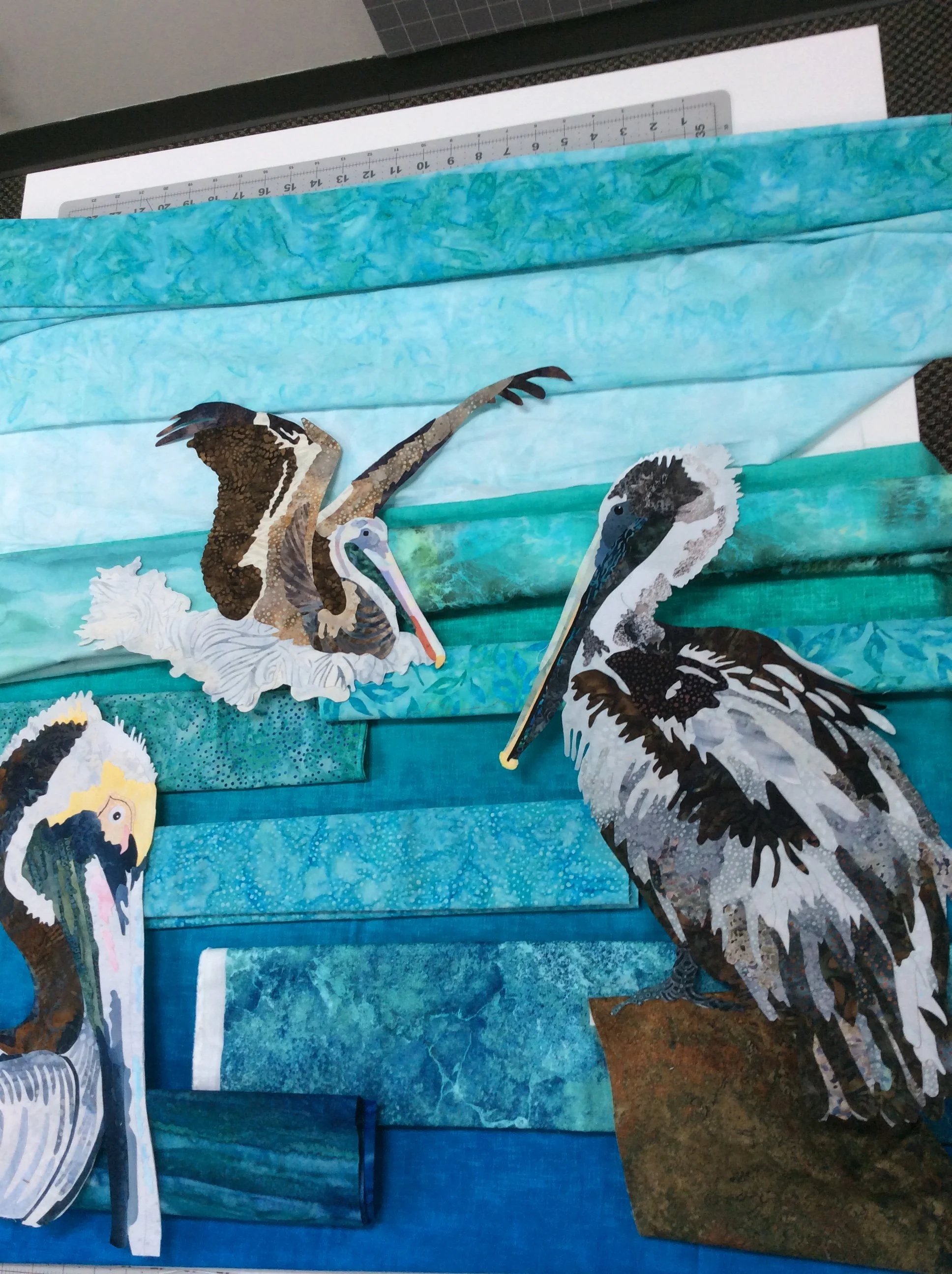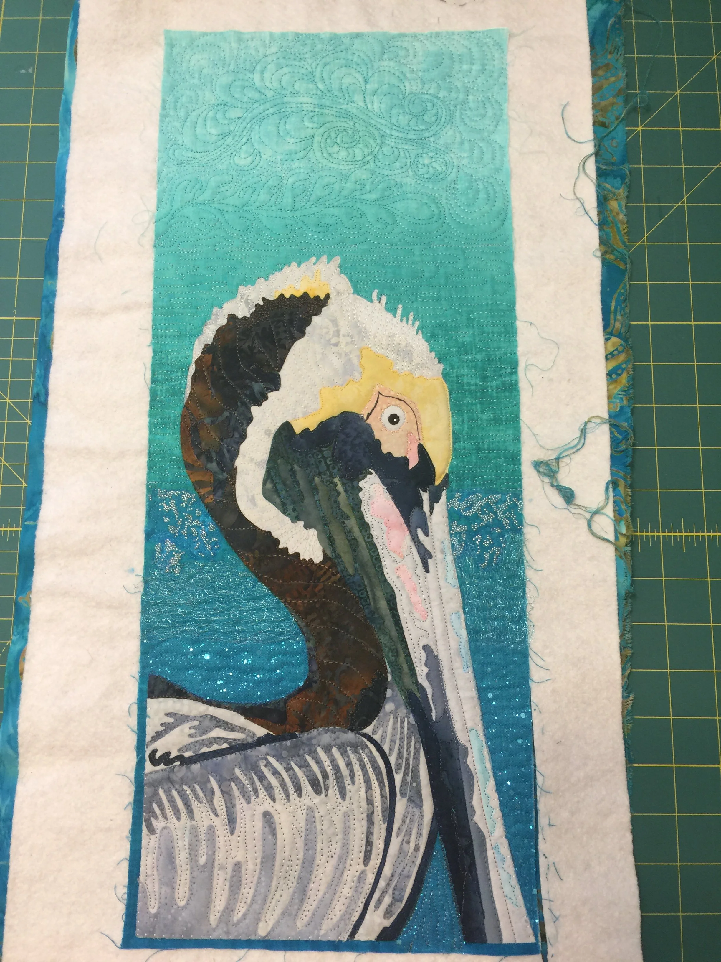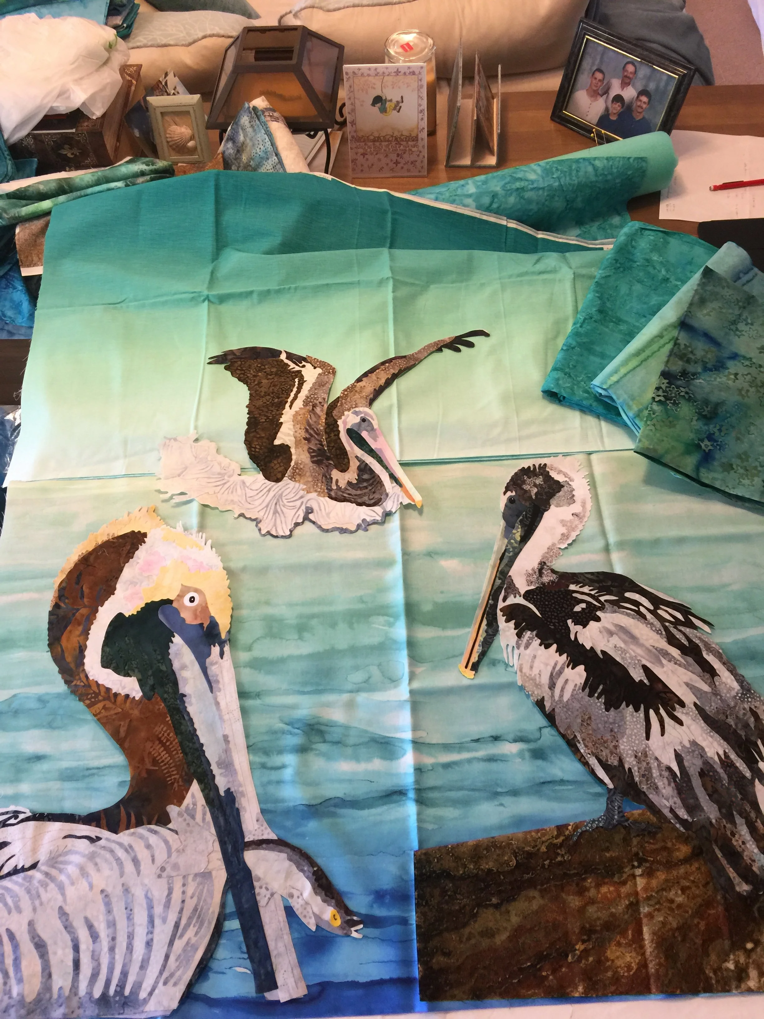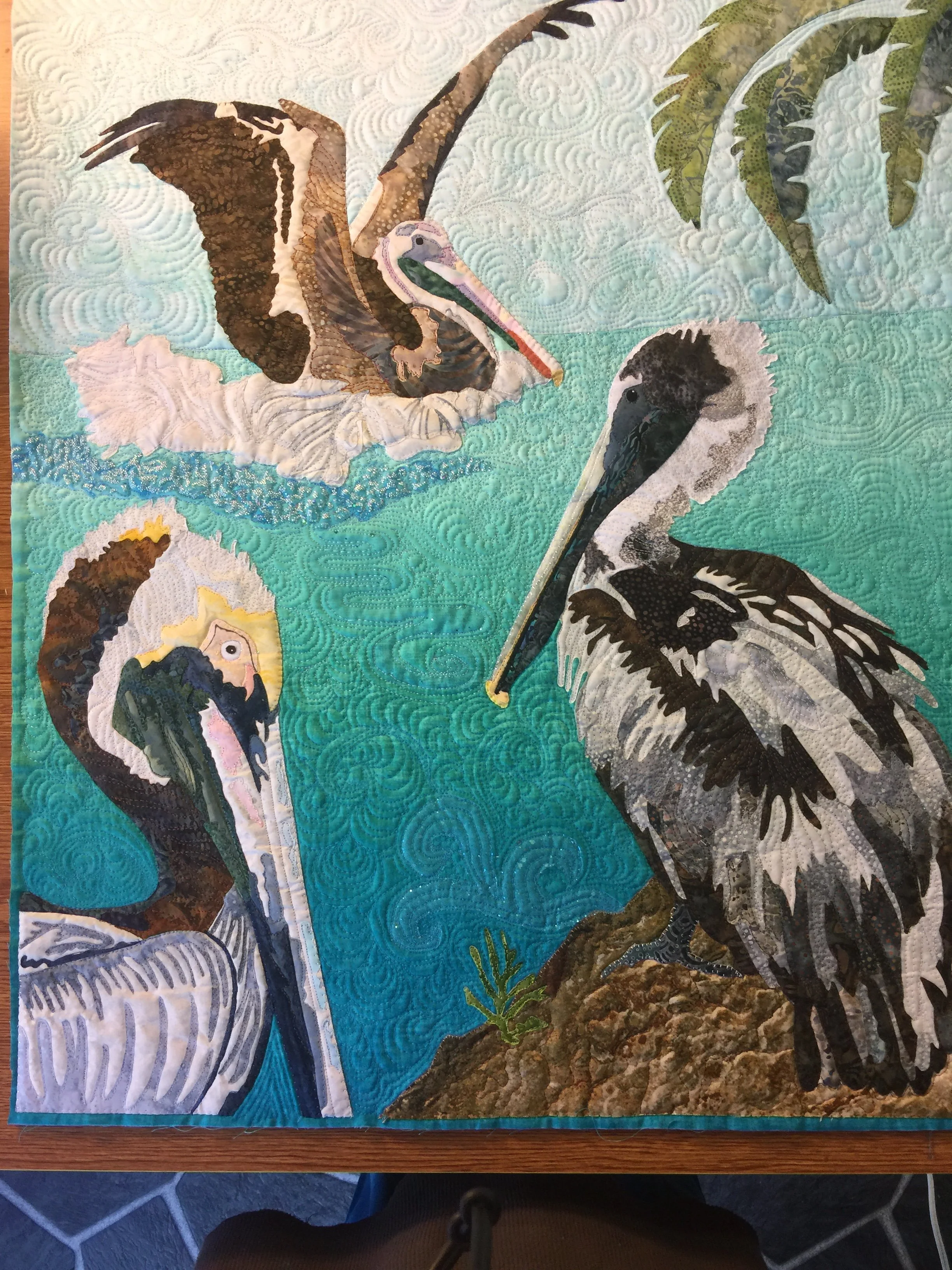My art group challenged each other to make a quilt, 25 X 30, using an ocean or sea theme. I was really excited about this challenge, as well, as I love the water and water birds. I had been wanting to do pelicans with their beautiful colors, shown in the pictures I had taken at Dauphin Island. Even though they are called a brown pelican, up close their colors are amazing. I had started making two of my quilt designs. I started making one the size that could be entered in a show, because the challenges were usually smaller. Plus, I thought if both boys liked the same quilt, they could each have one. So I made 2 of each of the pelicans, in order to make 2 quilts.