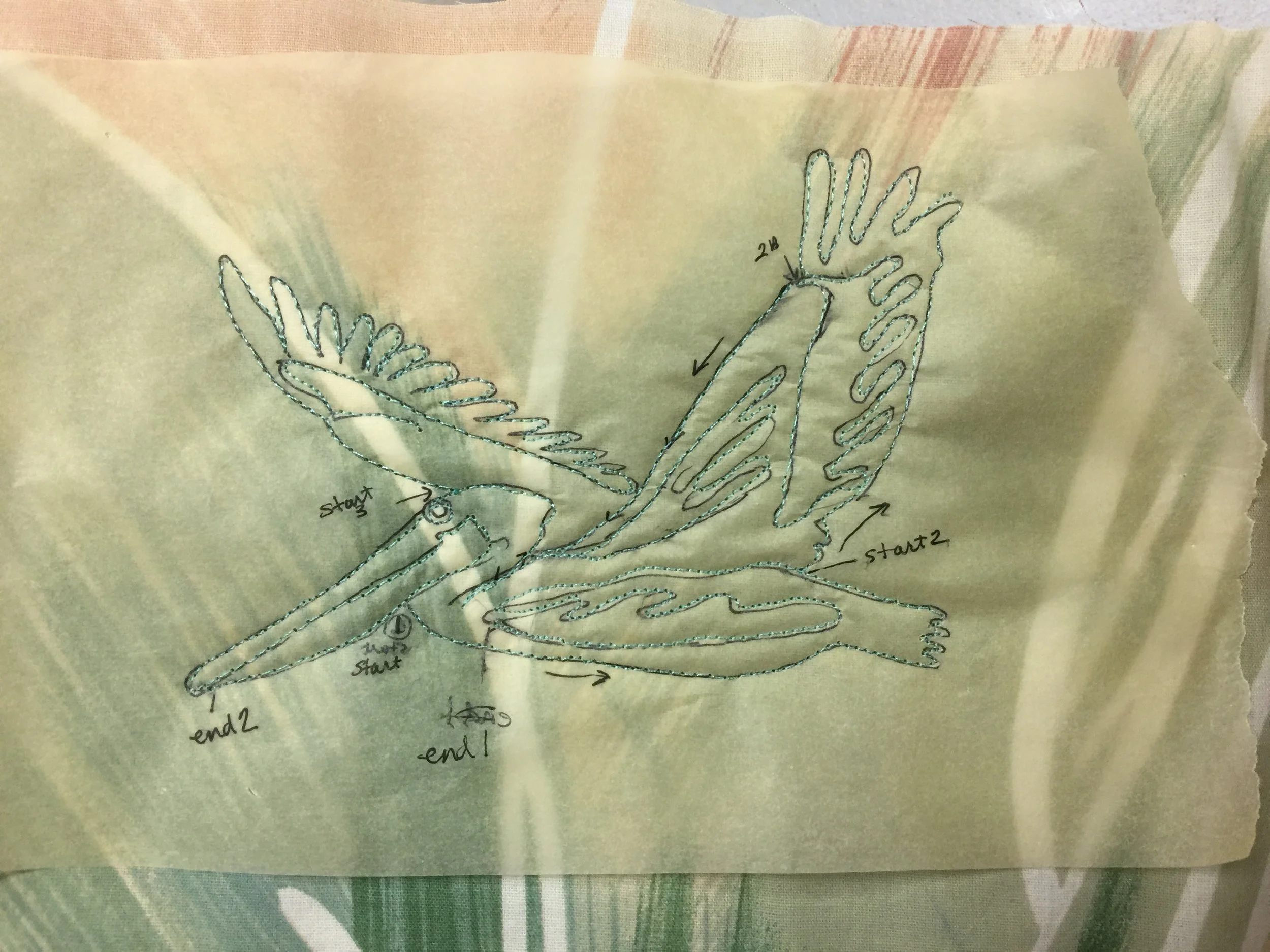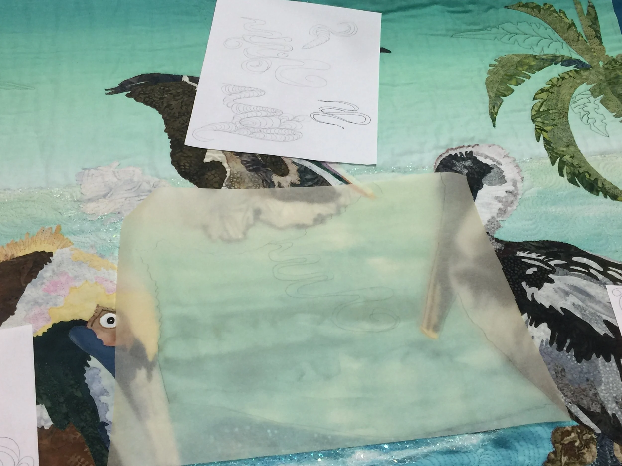 For this one, I wanted to add pelicans flying in the sky. I found a couple of my photos of them in flight. I traced over them, trying to make it a one continuous line pattern. I needed to reverse the image, because I quilted from the back. So, I drew my pattern on tracing paper, attached it to the back with pins and followed the lines. I removed the paper. I practiced on a scrap piece of fabric, to make sure it worked. I used 12 wt. thread in the bobbin, so it's more noticeable from the front.