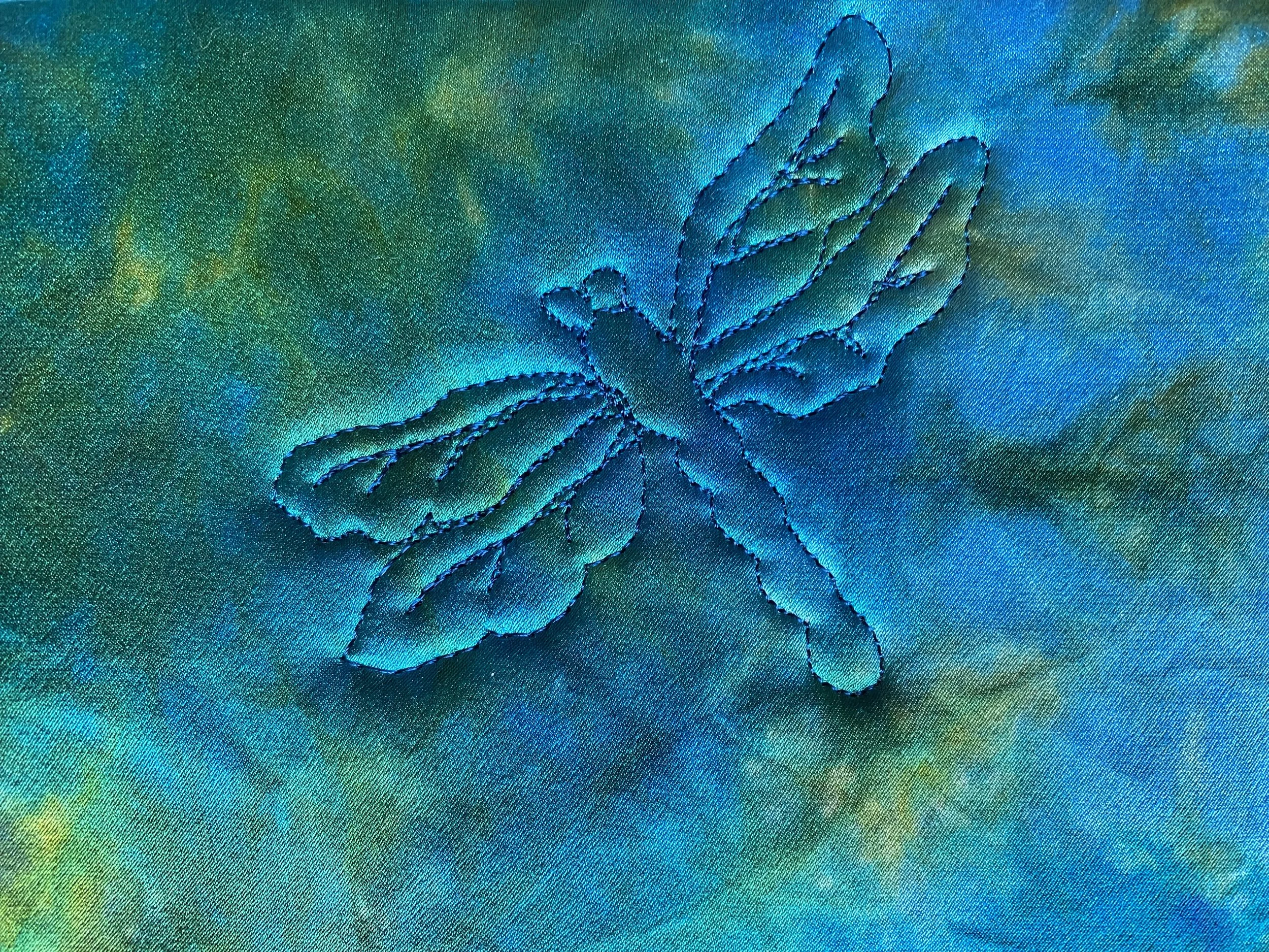 A small number of the art group ladies decided they wanted to attempt to paint a quilt on silk. I’m not a painter, and I prefer working with commercial fabrics, but I wanted to experiment with painting on silk which I’d never done. So, I joined in with the other two ladies. I love to photograph nature, especially dragonflies, and I’d been wanting to do a dragonfly quilt. So, I chose a photograph that I had taken of a Blue Dasher dragonfly to see if I could capture the colors of the dragonfly, and trying to paint translucent wings.