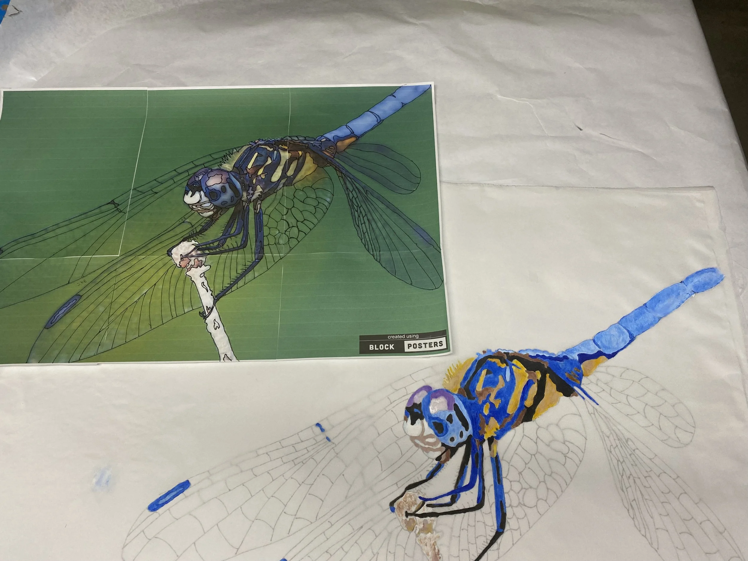 Once we started painting, I traced the lines onto the silk, using a very thin paint brush. Using the actual photo, I mixed paint to get the color and value I wanted for the dragonfly, tried it on the practice piece, and then proceeded to paint. We painted from the lightest to the darkest color of paint. We mixed the paint with extender mix to get the thickness we wanted the paint to be. We wanted thin, light areas of paint, so we could add layers to darken shadow areas. We used Pro Fab opaque white as a resist prior to painting other colors. In moving the piece from day to day, if needed, we were careful NOT to bend the freezer paper so it would not cause the paint to puddle in that area. The freezer paper remains attached to the back of the silk throughout the painting.