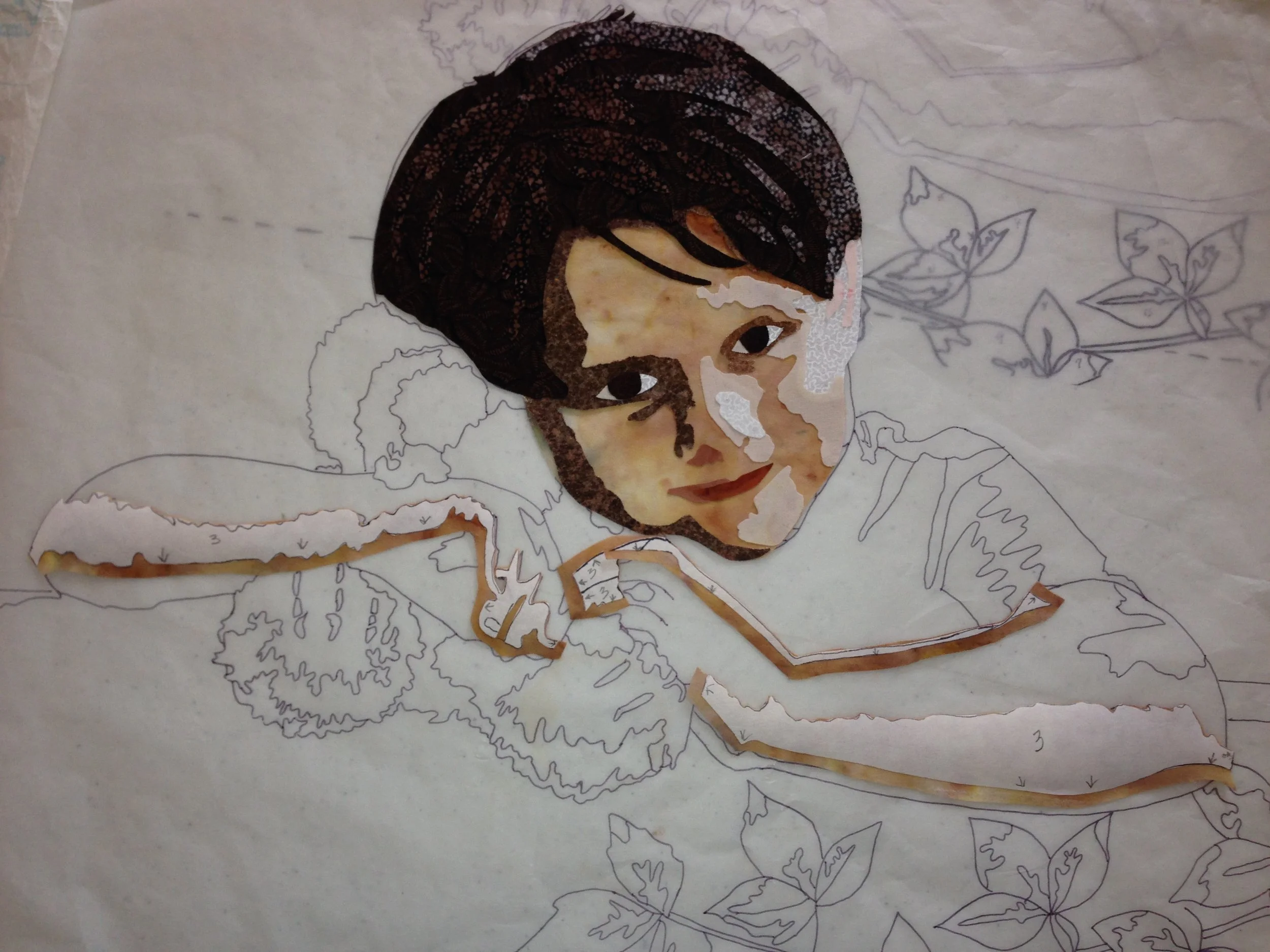 Then I enlarged it, put it on a light box, and traced the pattern that I wanted on tracing paper. The pattern was then traced from the tracing paper to freezer paper. I cut out the freezer paper piece that I needed and ironed it onto the fabric. You leave the freezer paper on the fabric once cut out, so that you can place the next piece exactly where it goes. This can be seen in the photos above.