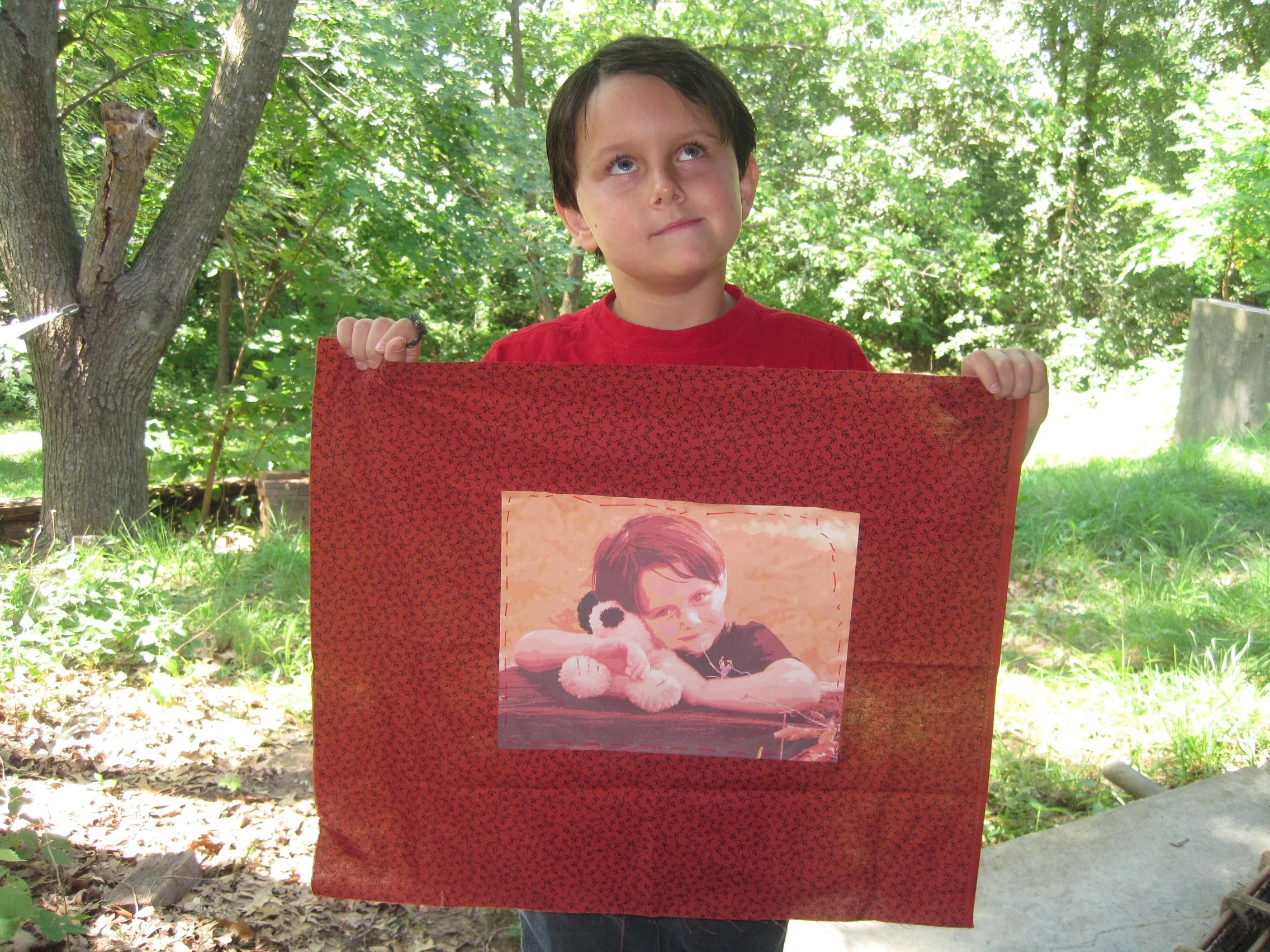 I showed Trey the quilt I was going to make of him, and he said he wanted to make a quilt. A couple of weeks later, we were in a quilt store and he reminded me. So, he picked out a red fat quarter, and I got red thread for him. I had no idea what he intended, but he seemed to know. So, when we got home, he took one of the 8 1/2 X 11 print outs, had me thread his needle, and he proceeded to sew the paper print on to the center of his fat quarter. I just loved watching him, and chuckled as I did. He did finish it (way before I finished mine).