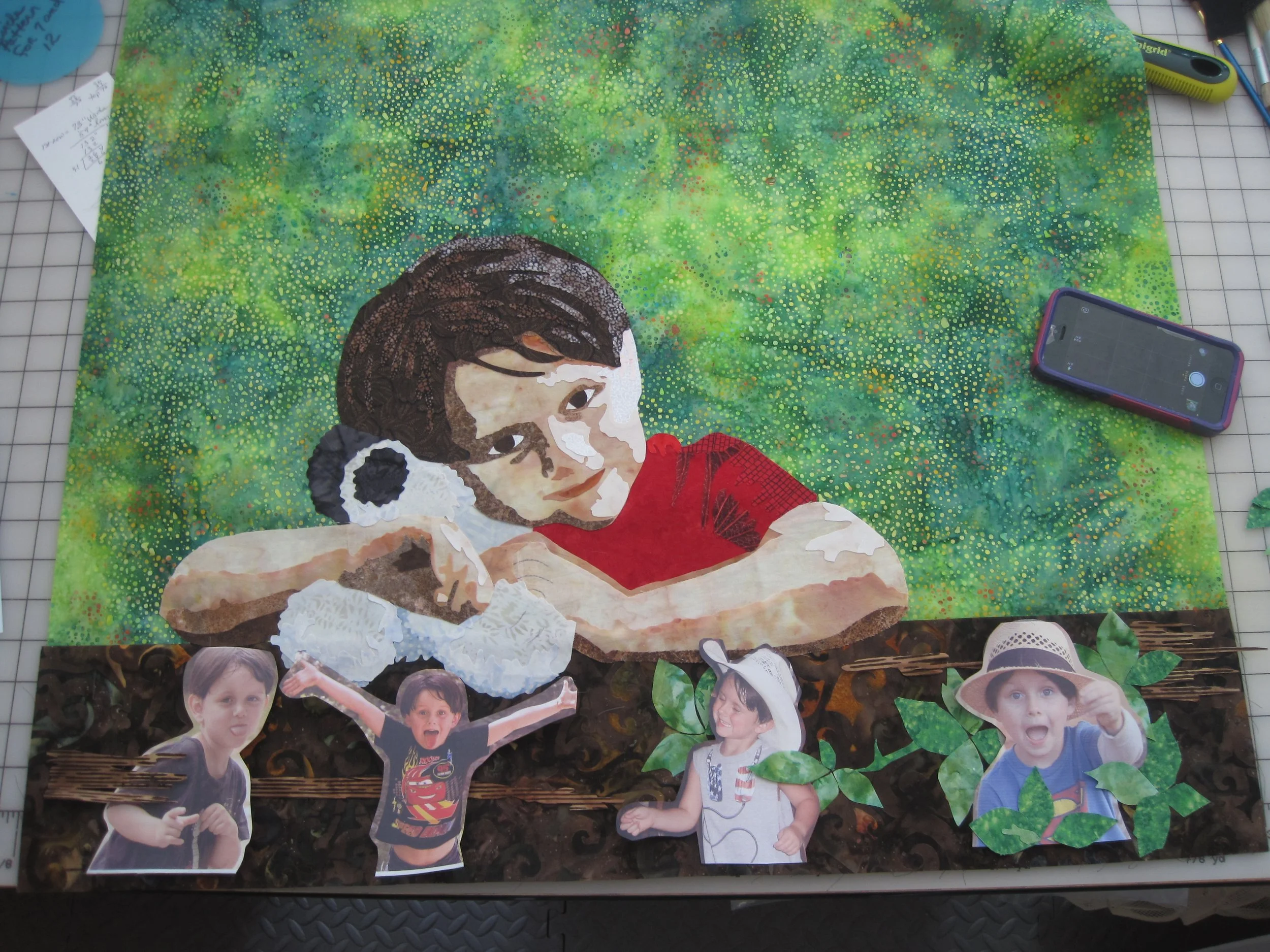 My grandson,Trey, always loved to have his picture taken. I loved to catch his expressions as he posed with no help from me. When we walked outside, I'd take my camera while he explored and he'd say take my picture Nana. This quilt was inspired by an un-staged angelic pose that Trey suggested, by getting behind the railroad tie wall with his Snoopy and saying, "Nana, take my picture." I couldn't resist trying to interpret it with fabric. The title indicates he isn't ALWAYS the angel he seems here. Some of his less "angel-like" images are on the right corner and on the back.