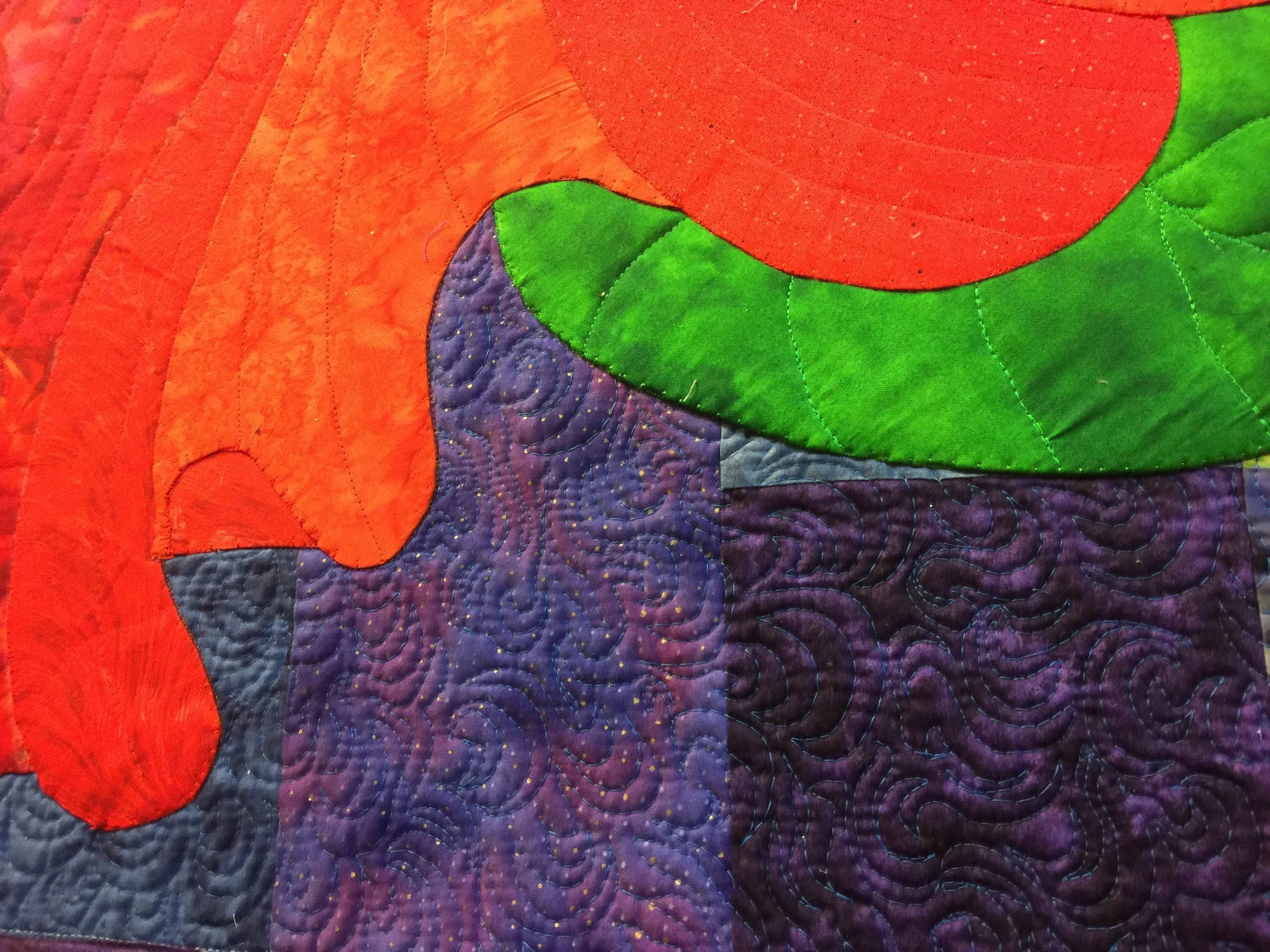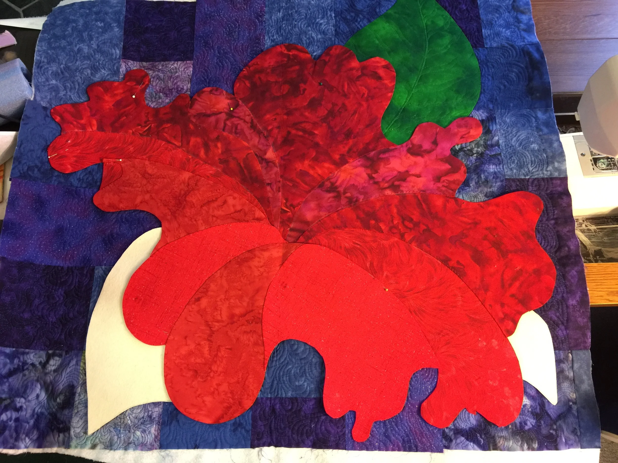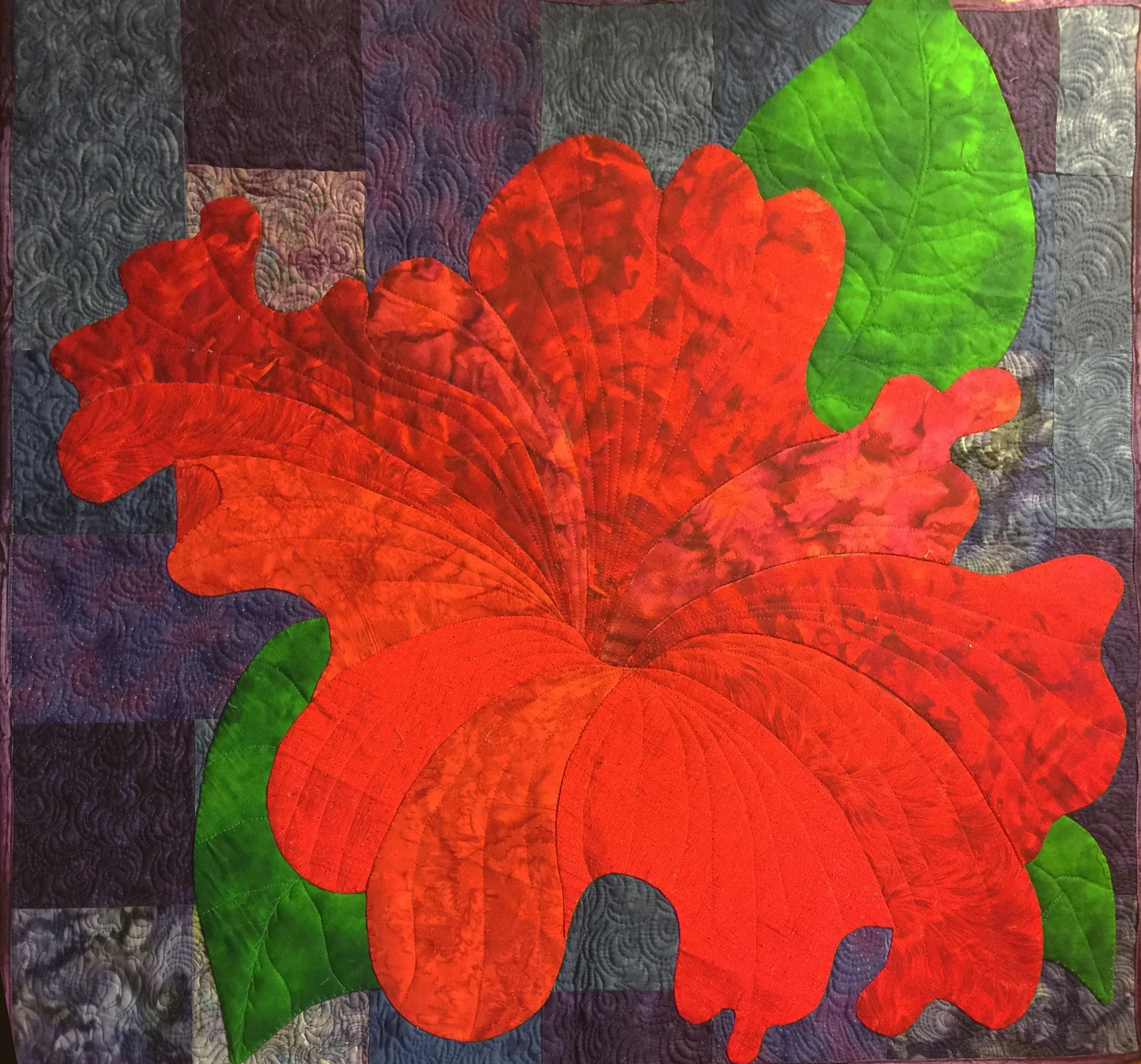 It was a workshop to show us how you could quilt BEFORE you put your appliqué on your quilt top, how to use felt for backing, and how to use a stiffener under your appliqué. She had some patterns of petunias. I changed some of the curved lines to suit me, and picked out purple fabrics to sew together in random order - no pattern was given for the background. Then I quilted the background (I was still fairly new to free-motion quilting at that time). I don't usually follow a pattern. Designing is one of the favorite parts for me in the process of quilting. So, I had decided to change the pattern a bit. She had one leaf, and I'd put my touch on it by making 3 leaves. So, I pinned two pieces of the green fabric to the quilting background, and it sat on my couch in my studio for 10 years. I probably didn’t get back to it, because it wasn’t an original of my own, and I didn’t have that attachment to it.