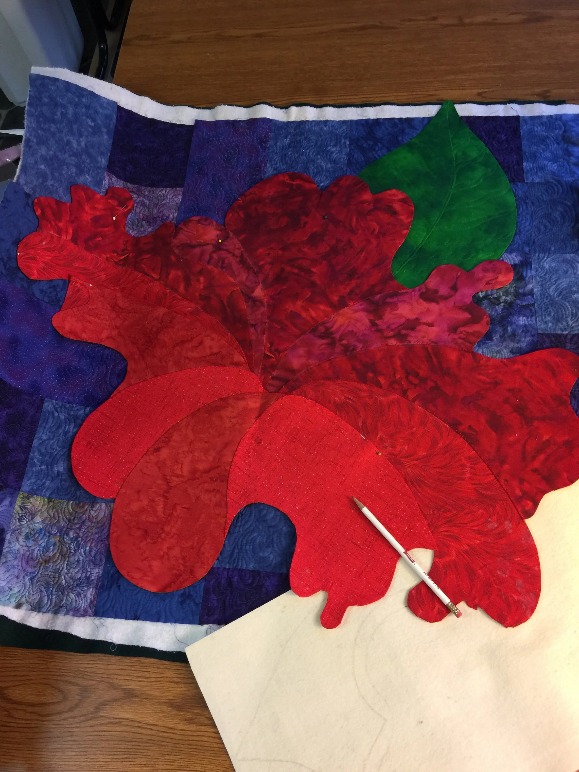 I took some white felt I had on hand, since I didn't have the stiffer material we used for the petunia, and sketched out two leaves that would fit in the two spaces in which I wanted them. I glued on the green fabric I had pinned to the background, removed the pins from the lower part of my petunia, and appliquéd the leaves down. I then appliquéd down the top part of the petunia, sewed down the seams with stitch in the ditch lines, and then quilted free-motion lines in the petunia top.