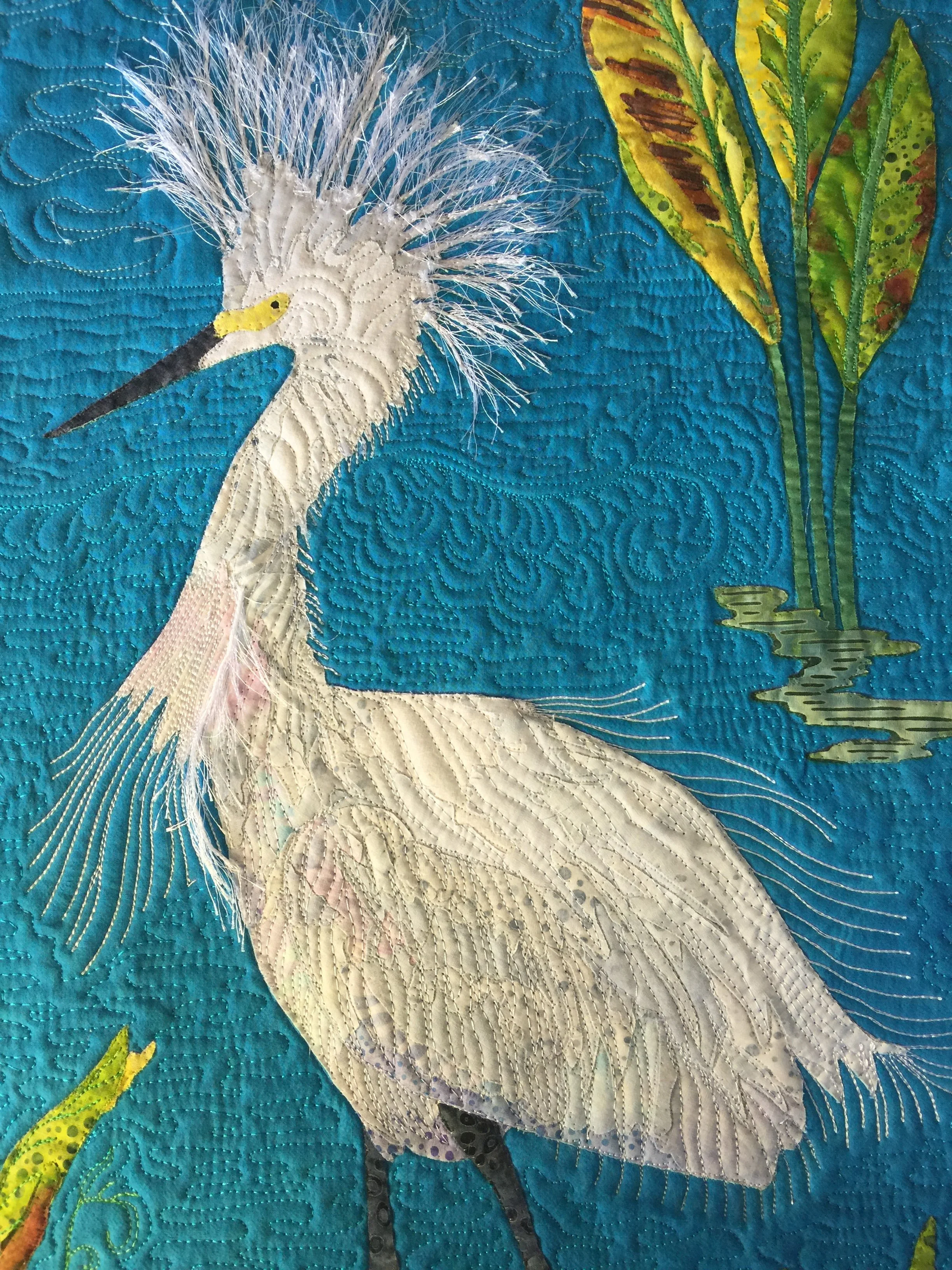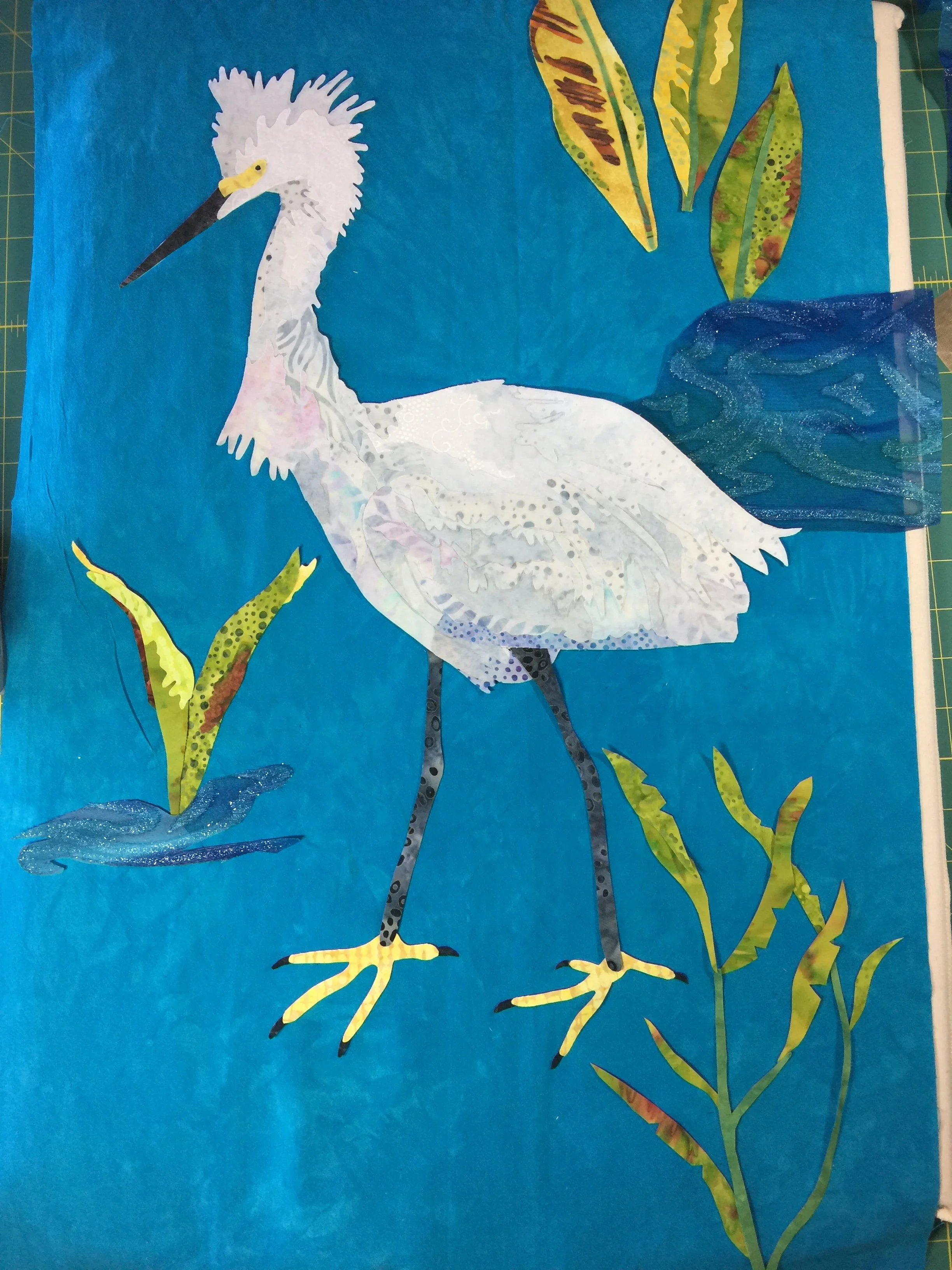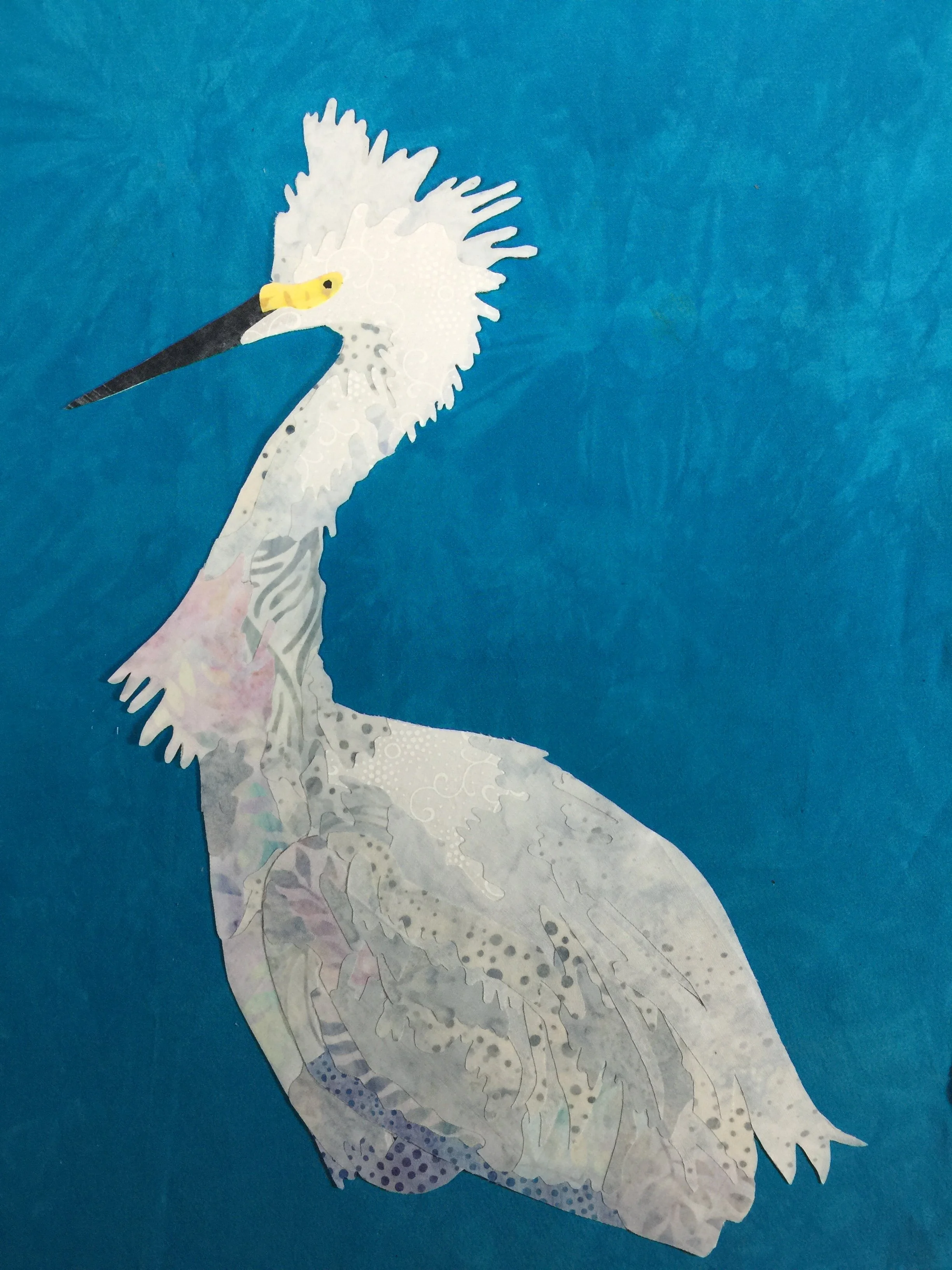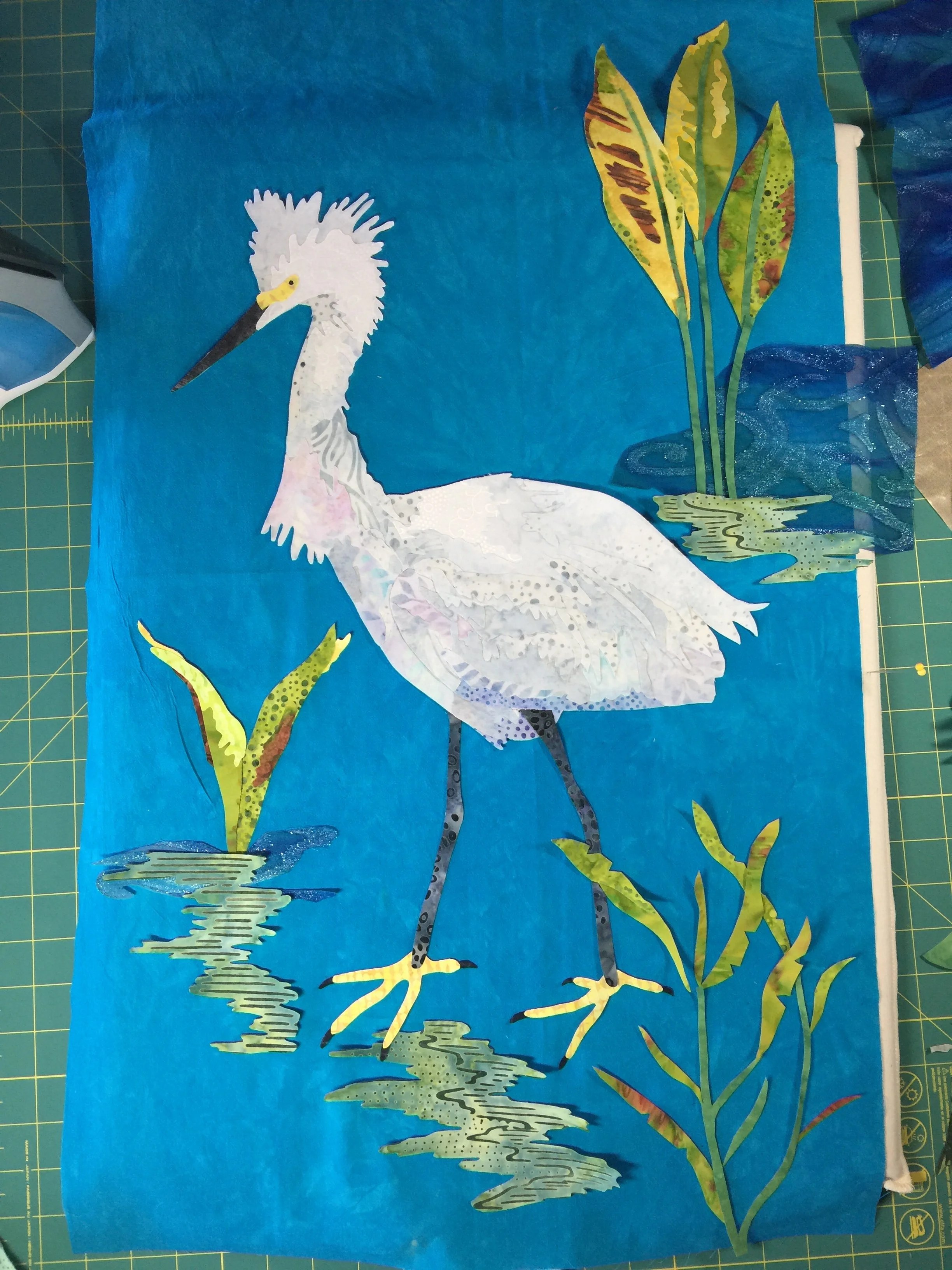 The first thing I did was start a pattern showing where lights and darks were to go. I debated the background and decided to use a whole cloth background with appliqué background pieces taken around the area where I got the egret picture. I was really impressed by some water plant colors in the marsh area and decided to include them. I added more detail in the egret, in order to make give it more depth and then auditioned fabric. I wanted to use light teals and pinks to add a change in value.
