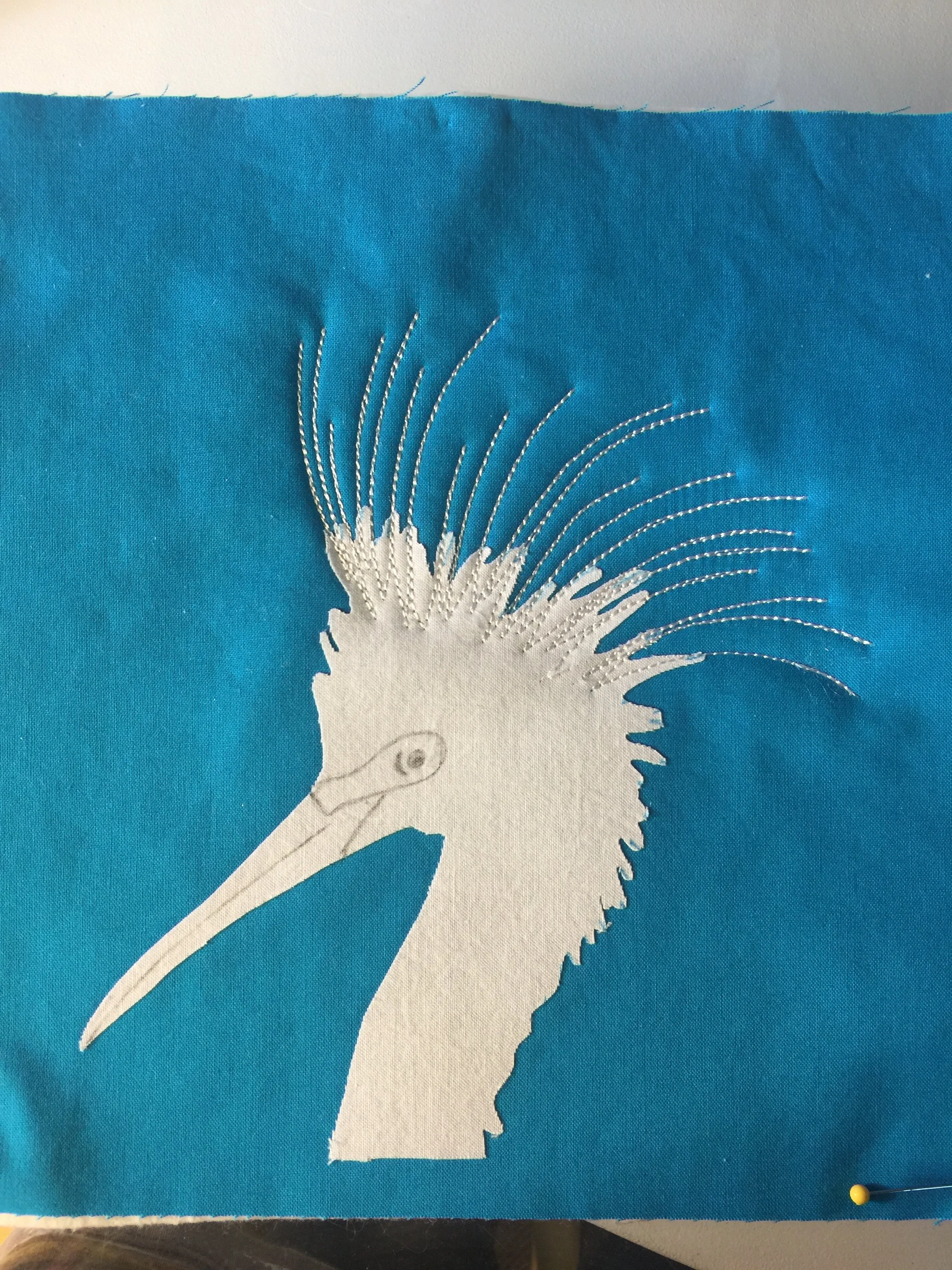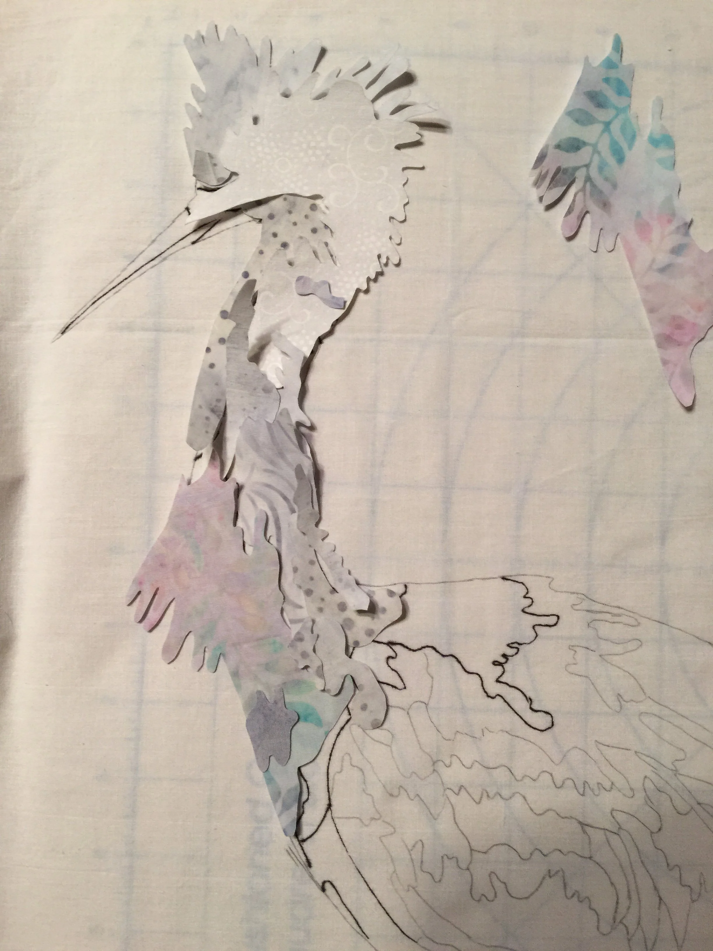 Once I had chosen the fabrics, fussy-cut them and had them laid out on the pattern, I traced the pattern onto a thin piece of white fabric, to keep the dark teal from shadowing through the white. I placed my pattern pieces, that were backed with Wonder Under, onto the white fabric, and ironed them down. This way I could move the bird around once I finished deciding on the background. I treated the leaves the same way, so that they could be moved around and I tried different layouts.